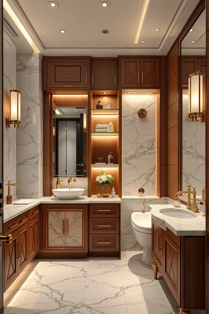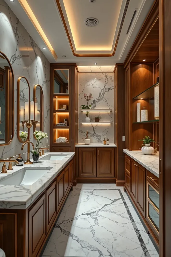 Luxury storage solutions can be a replica of the experience found in the bathrooms of a boutique hotel, as in my case. Such designers as Kelly Wearstler have popularized the trend of using bold materials and dramatic finishes in order to develop showcase bathrooms. I tend to use these luxurious interiors as an inspiration to make it dramatic and kind of classy.