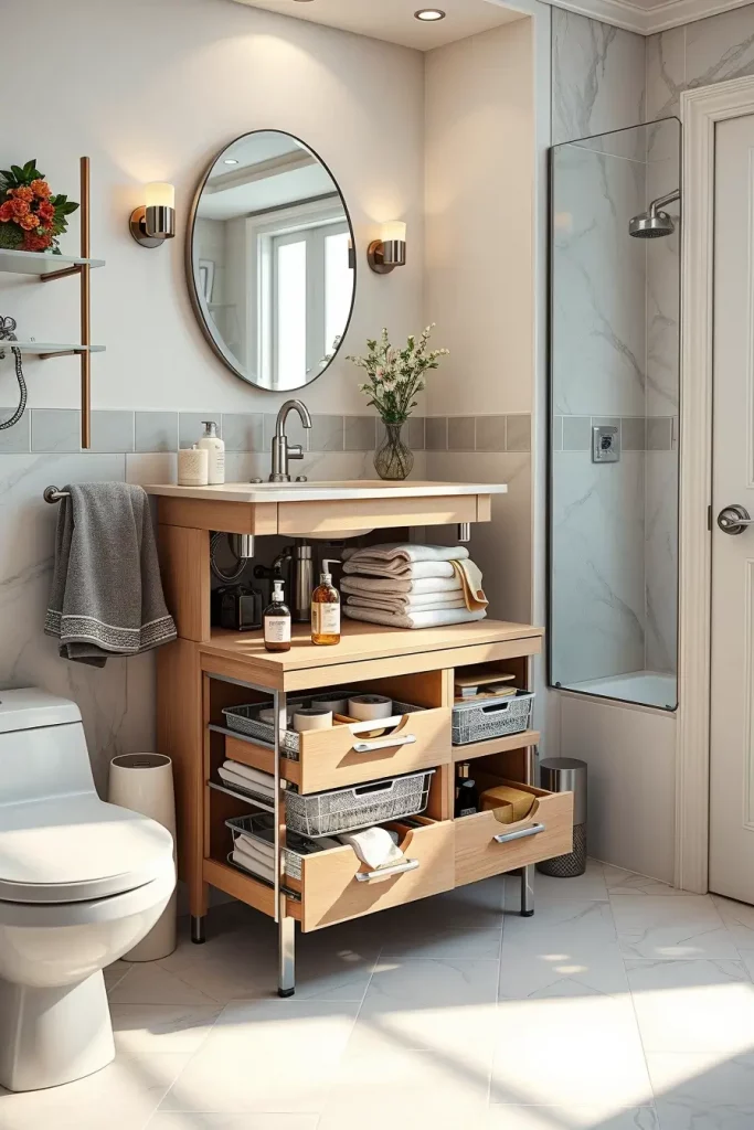 The items that I tend to pick up would be high freestanding towers, mini drawer chests, open shelving with basket baskets, or carts on wheels that can be rolled next to the vanity. Such cabinets can be easily rearranged and by selecting lightweight materials such as aluminum frames or smaller wood structures will leave the room open. The use of neutral tones like white, oak or matte gray helps keep the picture fresh and coherent.