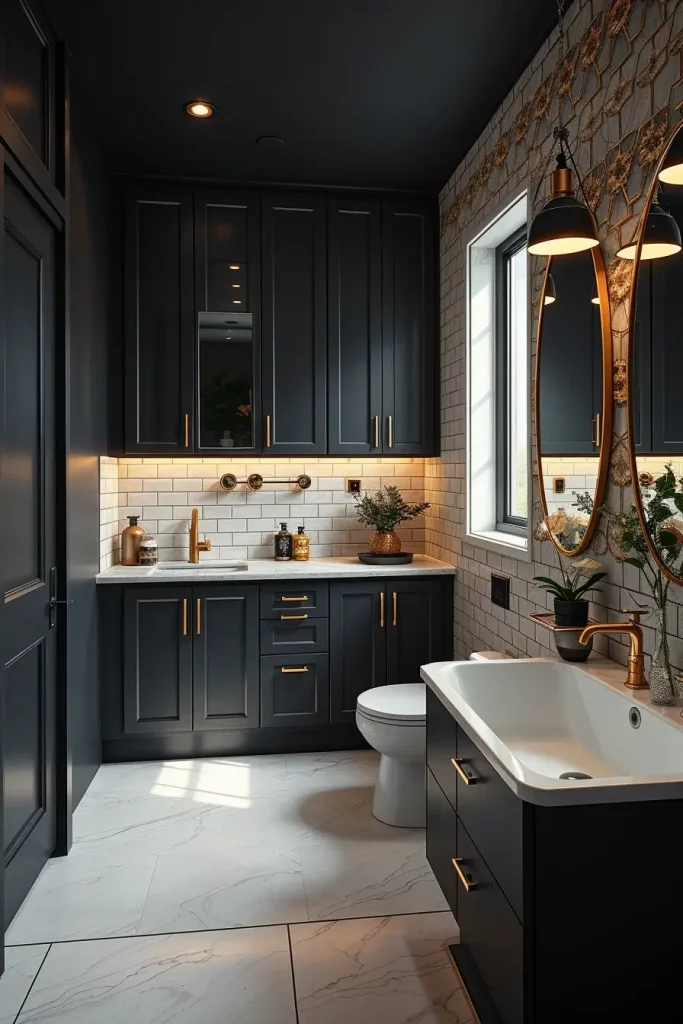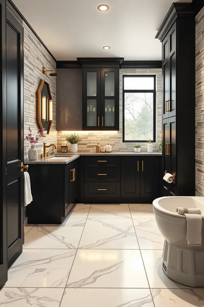 The particular items I personally prefer to use are matte black vanities, tall floor-to-ceiling cabinets, and floating storage units that focus on clean lines. These cabinets go well with hardware finishes of brushed gold or chrome or in matte black. To ensure that the room does not look too dark, I usually incorporate a feature like soft LED lighting in the room about the mirror area, warm wall sconces or reflecting surfaces like glass or stone. These aspects make the cabinet bold-looking and the entire bathroom bright and welcoming.