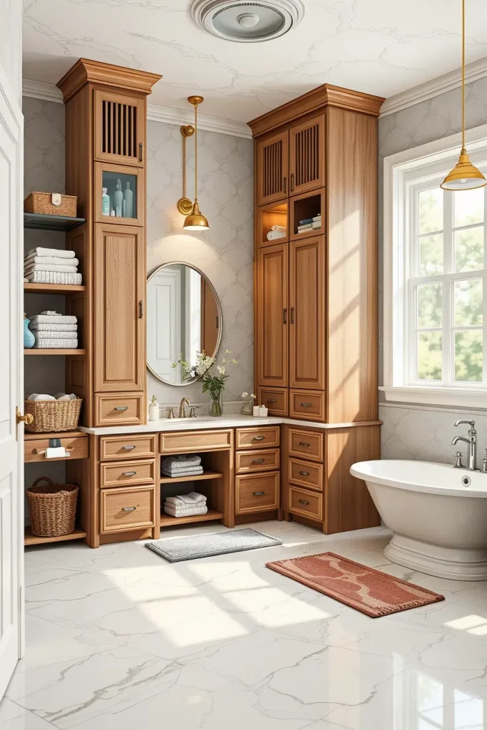 The tall bathroom towers are a unique method of incorporating floor-to-ceiling storage, particularly in those bathrooms that have unused storage in vertical space. I have observed the effectiveness of these towers in my designing work to ensure that the room has a lot of space and storage without occupying the floor space. Their size enables the homeowners to divide the daily necessities and those that are seasonal and they are well arranged.