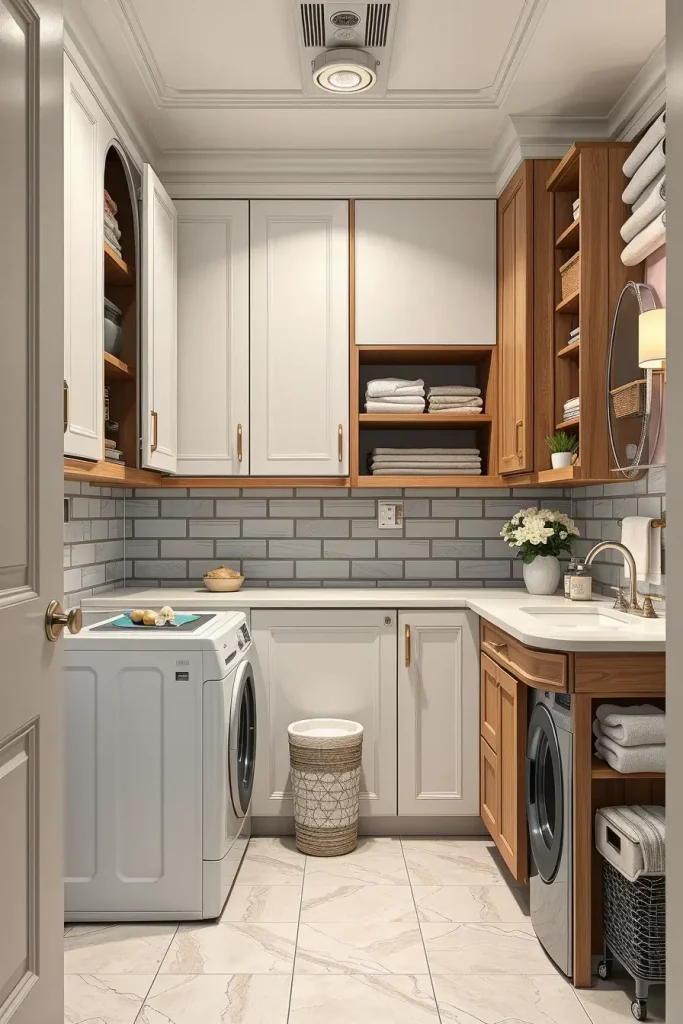 The items I tend to include are tall cabinetry where the stacked washers and dryers can be concealed, pull-out laundry devices, shelves to store the detergents, and specific areas that hold cleaning goods. I would also incorporate conventional bathroom storage including vanity cabinets and linen towers to make the latter two spaces feel united. The materials should be solid enough to resist moisture, vibration, and frequent use- composite woods, thermofoil and melamine finishes are good materials.