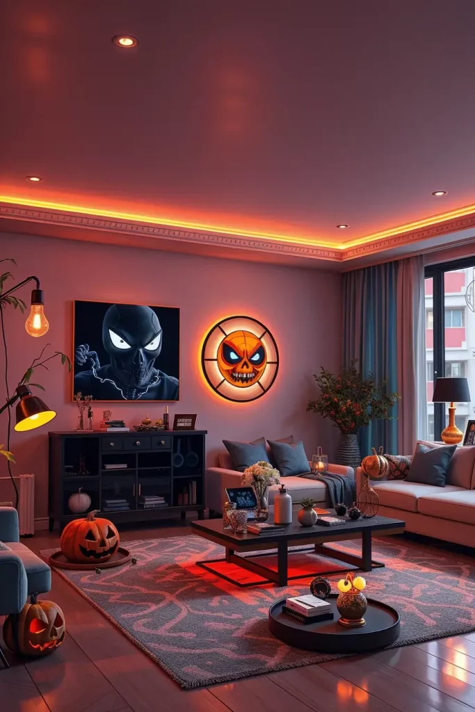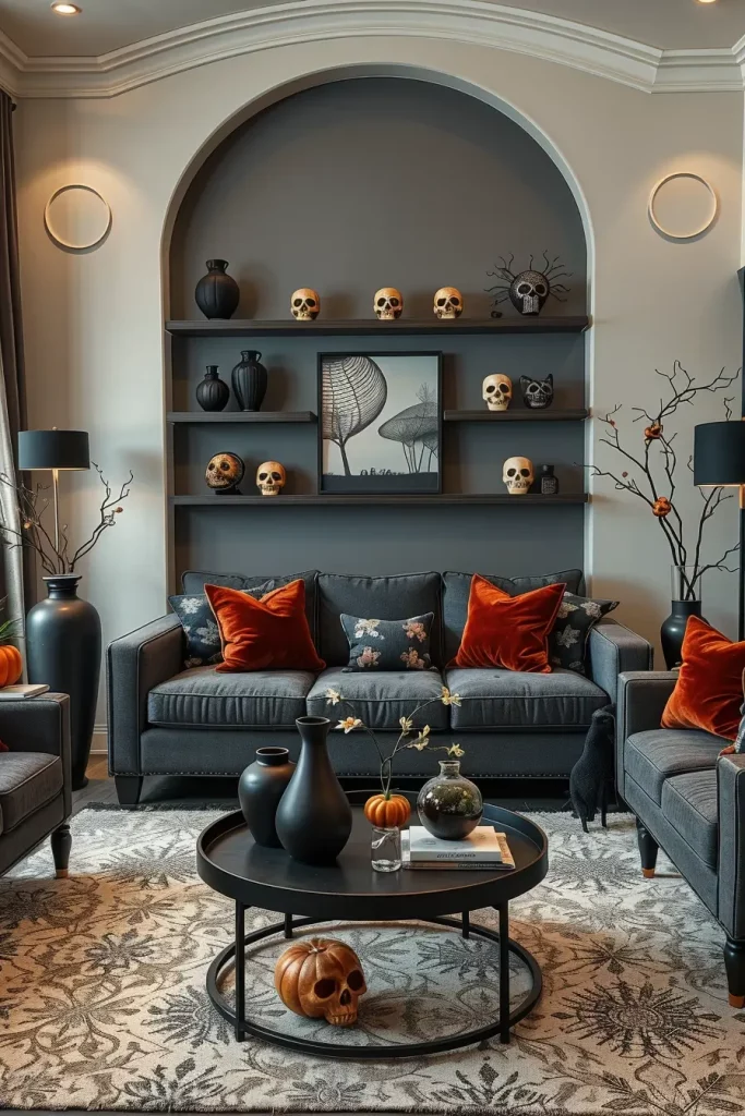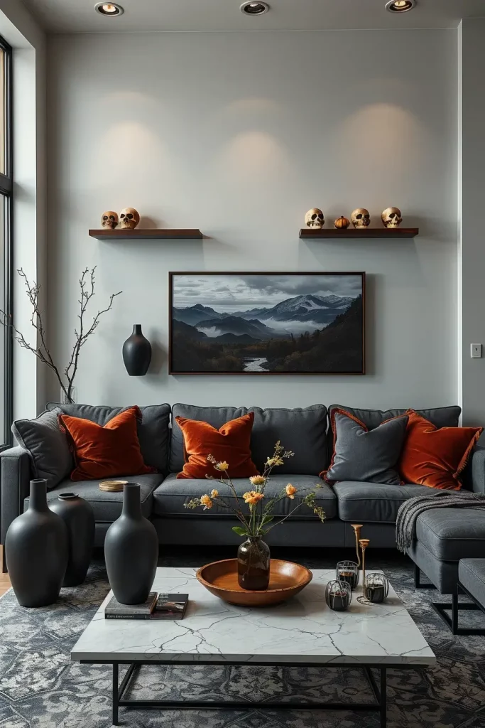The use of such details as matte black vases, rust-colored velvet cushions, and floating shelf decorations with miniature skulls or abstract ghost figures is very effective. These spooky accents are put in the spotlight by clean silhouettes on furniture such as low-profile sectionals or Scandinavian-style coffee tables. A charcoal gray area rug with worn web designs gives the room depth without overcrowding the appearance.