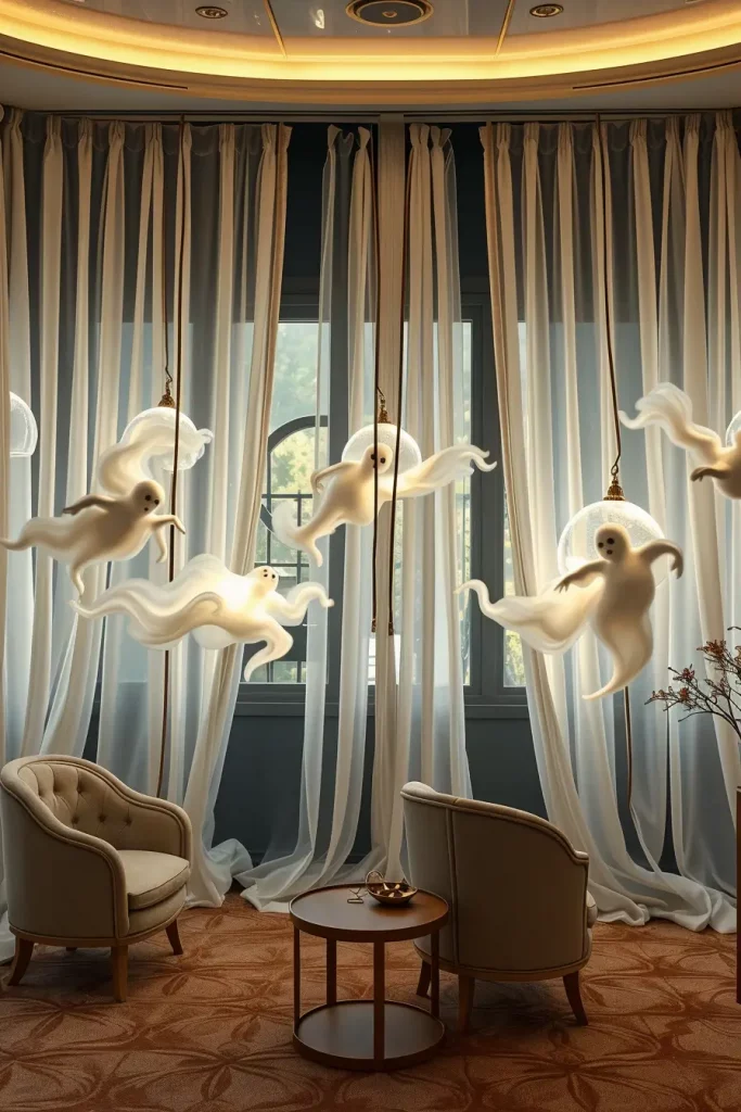 Ghosts need not be gaudy. Indeed, I like the trend of chic ghost-themed decor as one of my favorites in 2025. I prefer to employ some subtle, floaty cloths, abstract ghosts sculptures or sheer curtains to create an eerie feeling without being cartoonish.