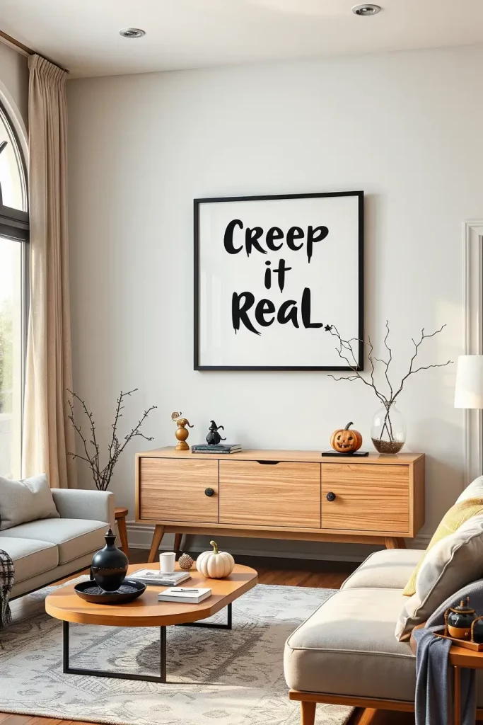 If you’re anything like me, you probably enjoy a good pun—and witty Halloween wall art is the perfect way to add humor to a stylish home. Wordplay and minimalism design are the trends of 2025, usually printed on canvas or floating frames.