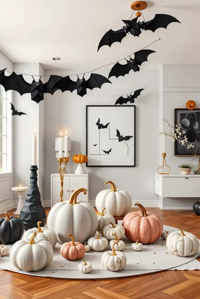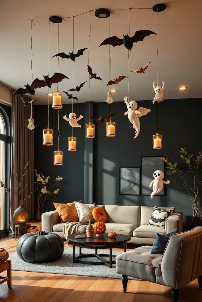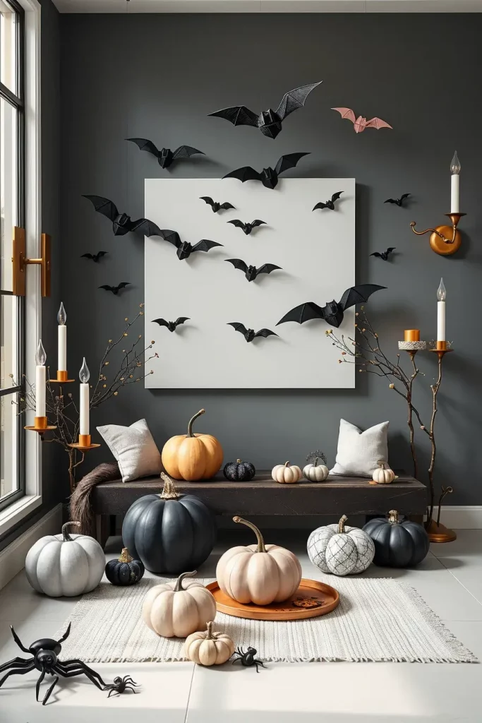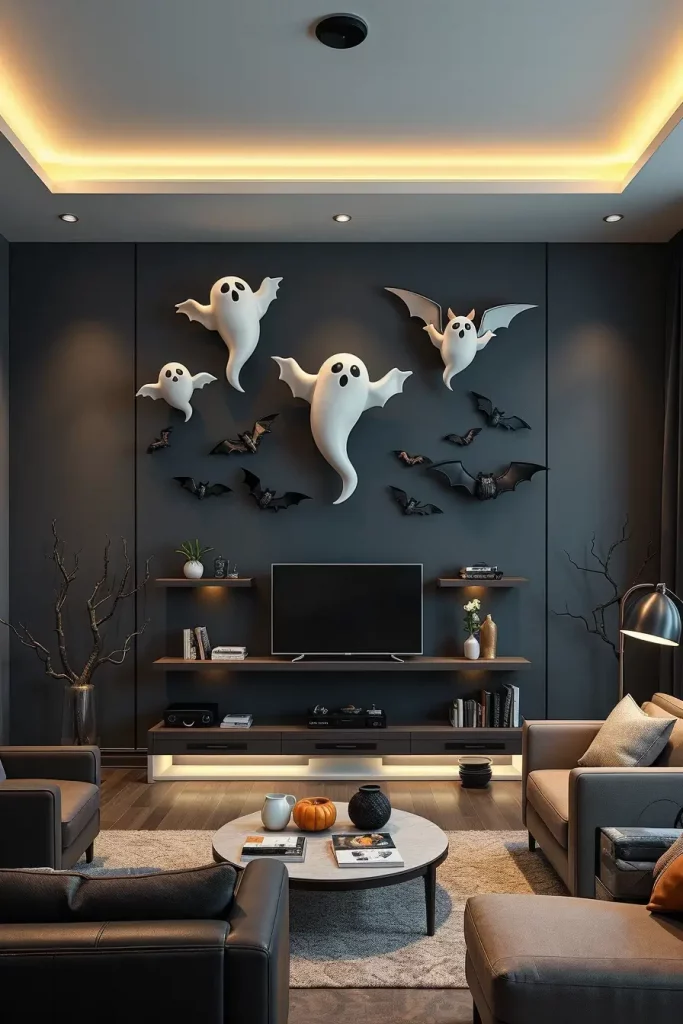 I’ve always found bat motifs to be one of the most dynamic Halloween design elements—especially when they fly overhead! Bat-themed ceiling and wall decor has become so much more architectural and stylish this year, especially in minimalist or modern houses.