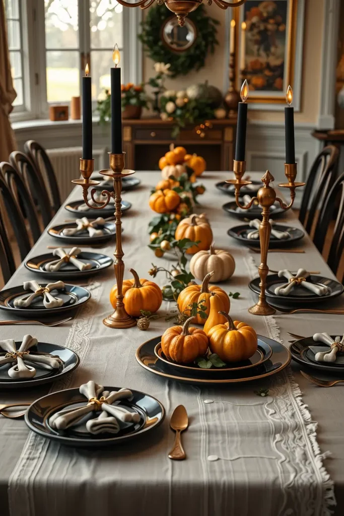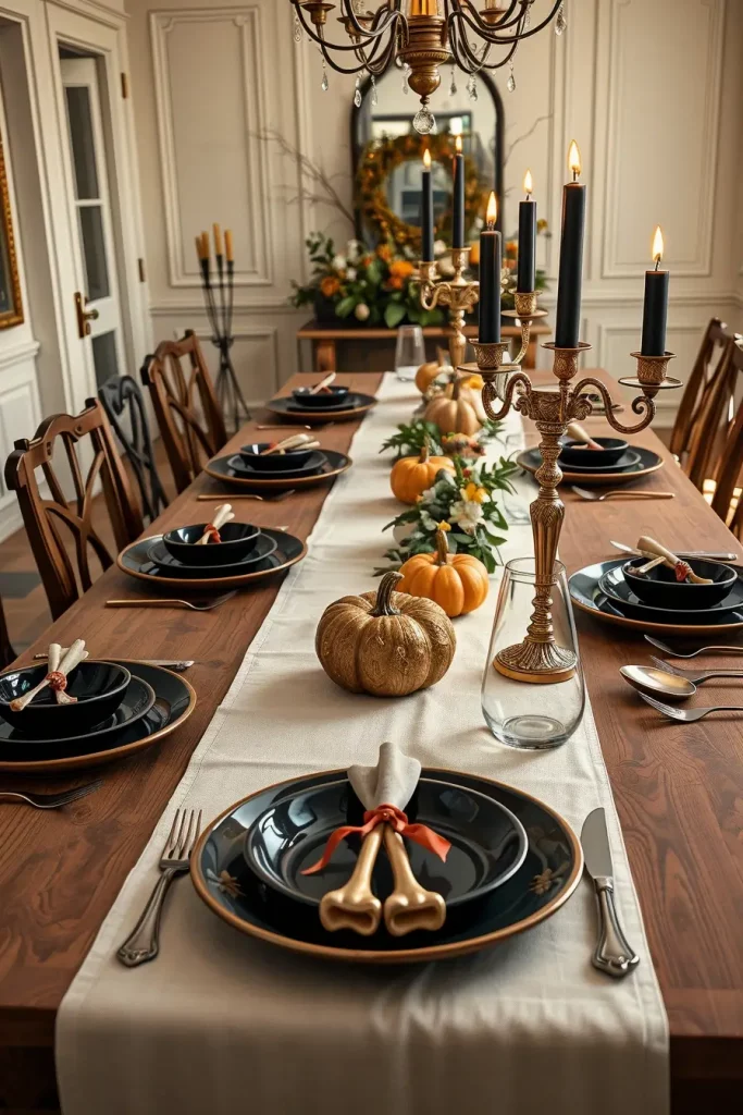 I usually begin with a warm neutral linen or burlap table runner, and then I put dark green or slate gray ceramic plates. I adore these with bone-shaped cutlery or slightly creepy napkin rings such as mini skeleton hands or brass spiders. Candle light is a must and I prefer candelabras, brushed black or aged bronze.