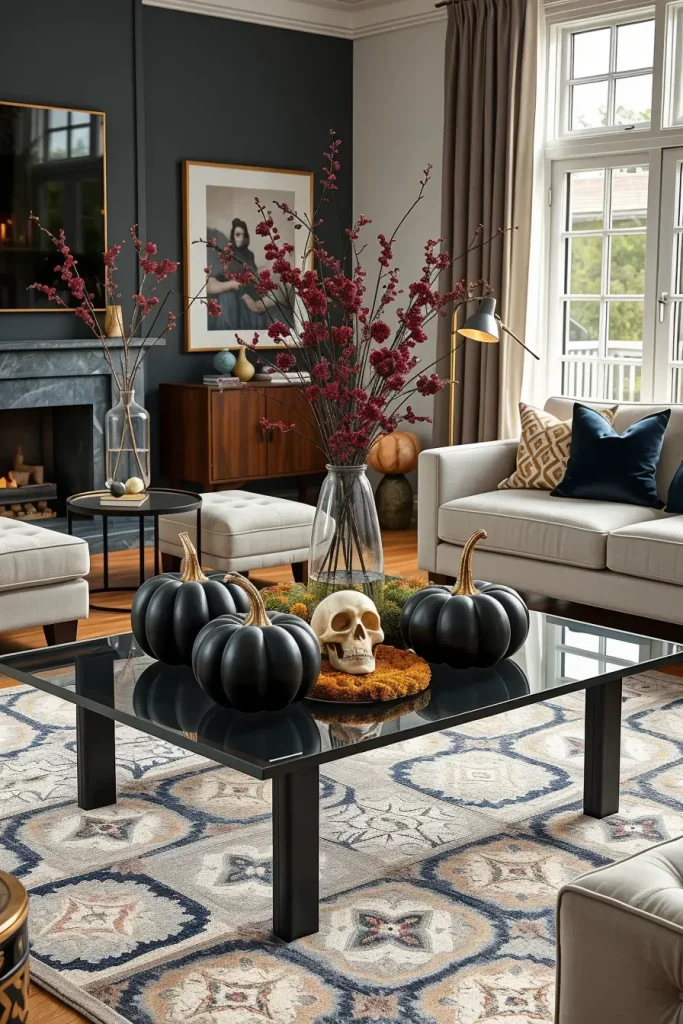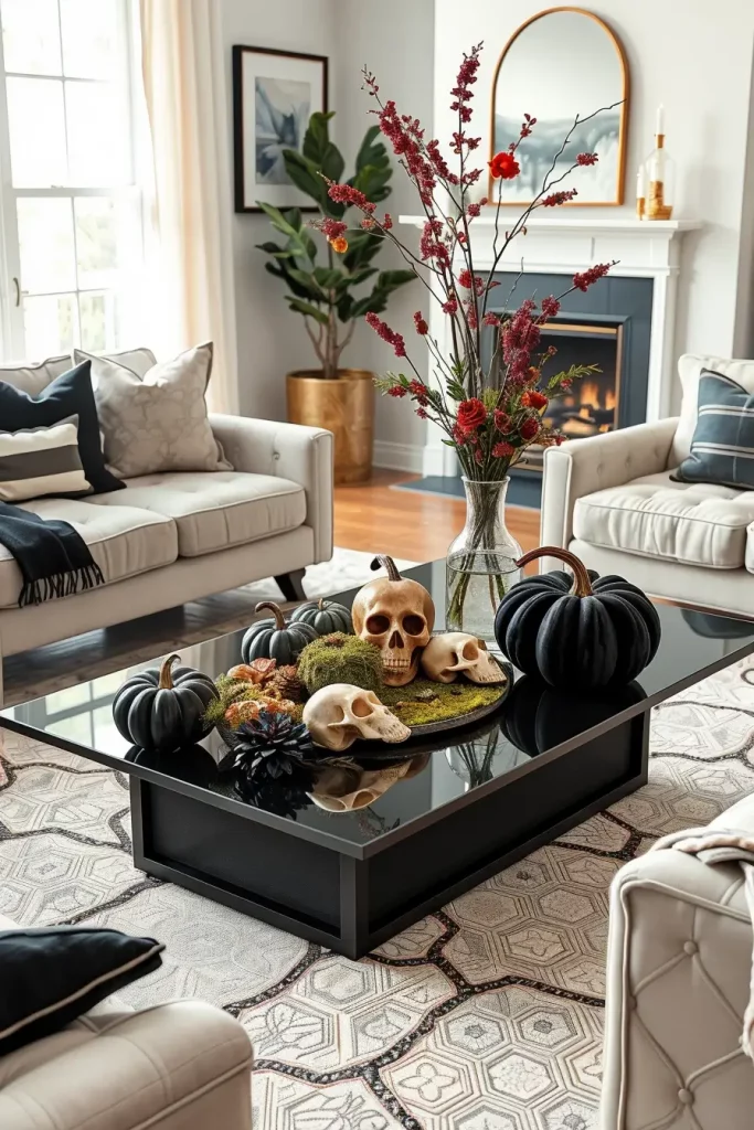 The other one I love is a smoked-glass tray on a coffee table, black taper candles, velvet pumpkins, and a decorative skull in moss. This display is a beautiful combination with clean-lined sectionals and geometrical area rugs. The scene is completed by a tall vase of dried botanicals in gray or burgundy color.