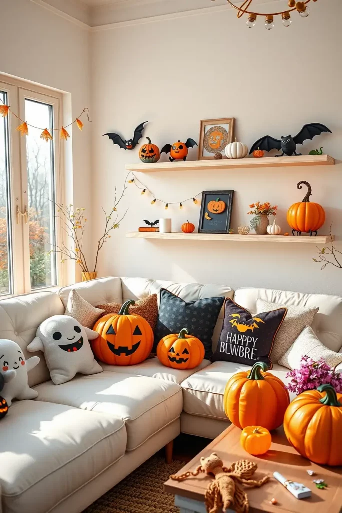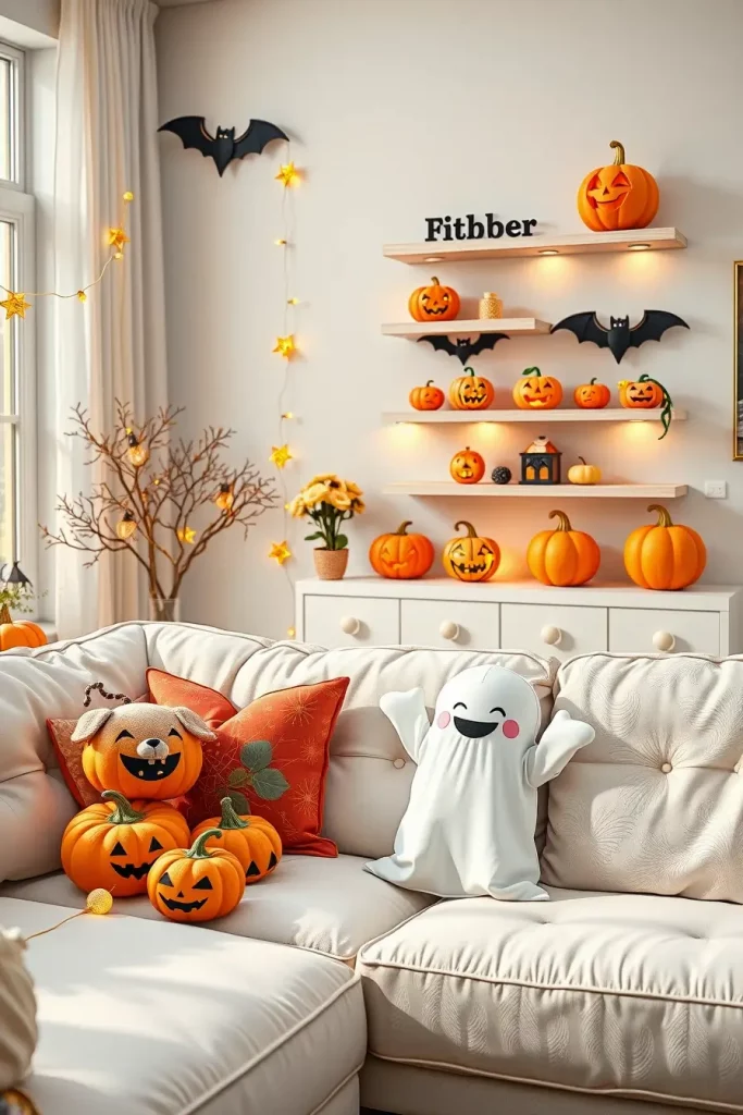 I tend to have neutrally colored furniture, white or gray sofas, pale wood shelving units, and I decorate them with whimsical items such as plush witch hats or cartoonish eyeball cushions. Curtain rods or bookshelves can be wrapped with light garlands in the form of pumpkins or ghosts to add a little extra whimsy.