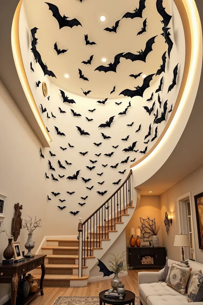 I prefer to apply smooth, matte vinyl stickers that fly over white ceilings or up the walls of stairwells. In another house, I used bats to make a dramatic effect by placing them in a sweeping curve above a floating staircase with uplighting. The result was classy, graphic, and spooky in a good sense. They suit best in rooms that have high ceilings or those with strong architectural lines.