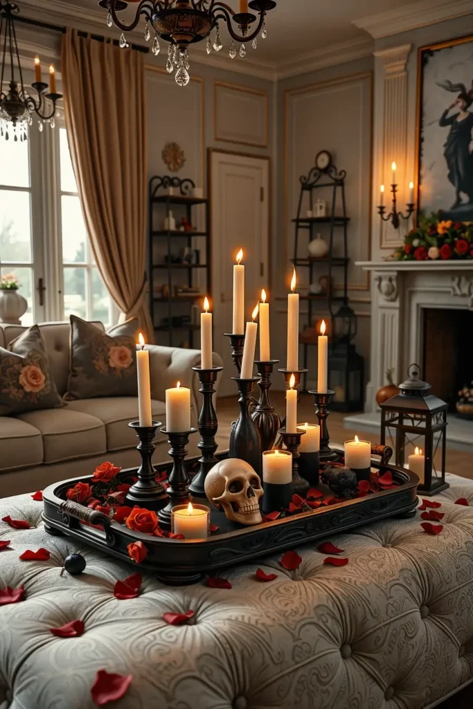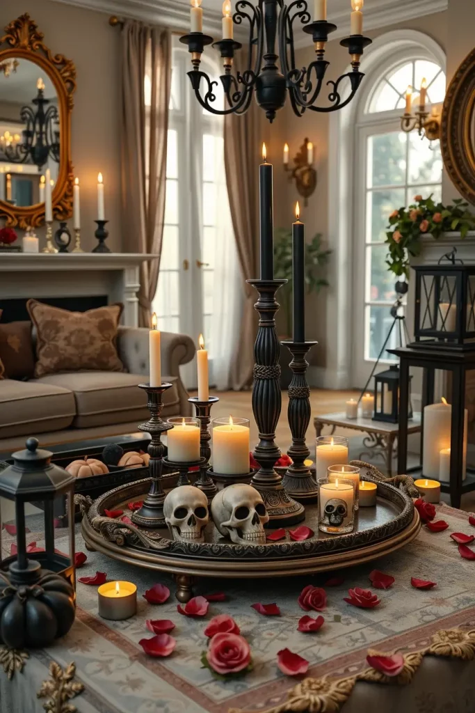 In my more elaborate designs I put candles of various heights on old trays or mantels of dark wood. The texture and safety can be achieved by mixing in black metal lanterns and hurricane glass holders. I prefer to put little skull-shaped tealight holders on the coffee tables or black rose petals, that haunted touch.