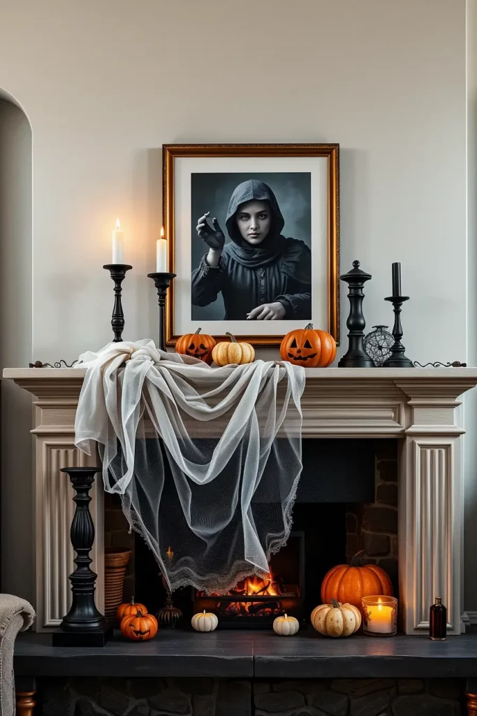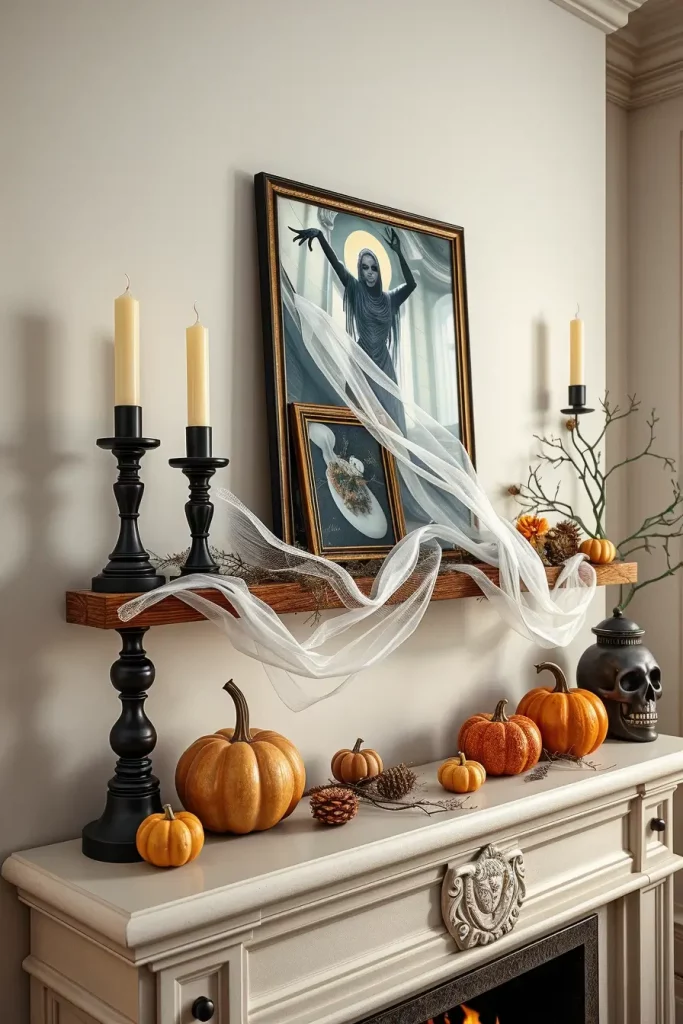 I like to build layers: a black-and-white abstract art work as the background and then cover the mantel with light gray gauze. Place tall candlesticks, small ceramic pumpkins and maybe a framed old photo in a distressed frame to add eerie elegance. The trick is contrast and unity.