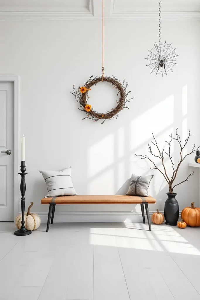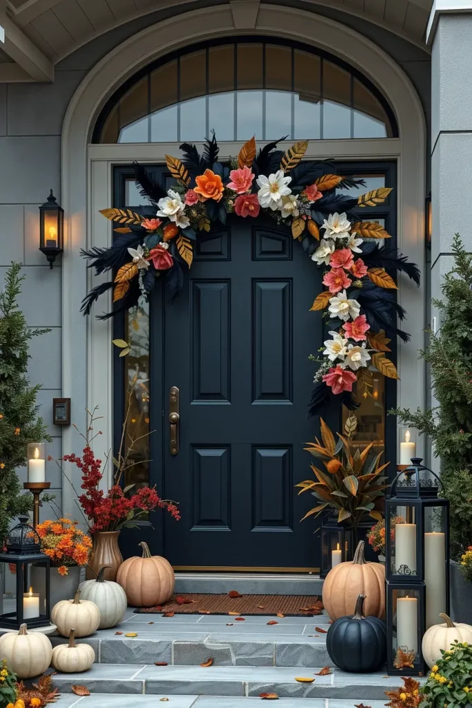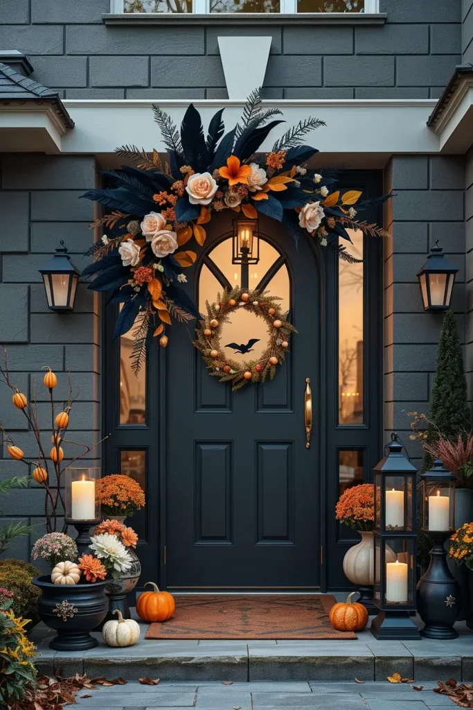 I suggest big wreaths 24 inches and bigger to have an impact. Select such materials as silk flowers, matte-black feathers, glitter-dipped pinecones. Place the wreath on a dark modern door or wooden panel entryway to have the best effect. These details elevate the Halloween doorway from basic to breathtaking, especially when paired with matte black planters or minimal jack-o’-lanterns in marble finishes.