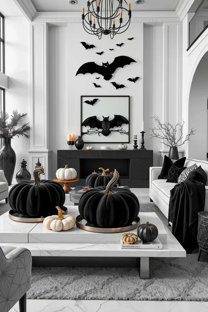 I am particularly cautious about textures when it comes to decorating a black-and-white room: matte black pumpkins, glossy ceramic skulls, and throws in velvet in onyx or ivory. I also add striped candle holders and plain black-framed art with minimalist Halloween images such as ravens or moons. Such ornamental objects appear deliberate and contemporary when placed on white or gray walls.