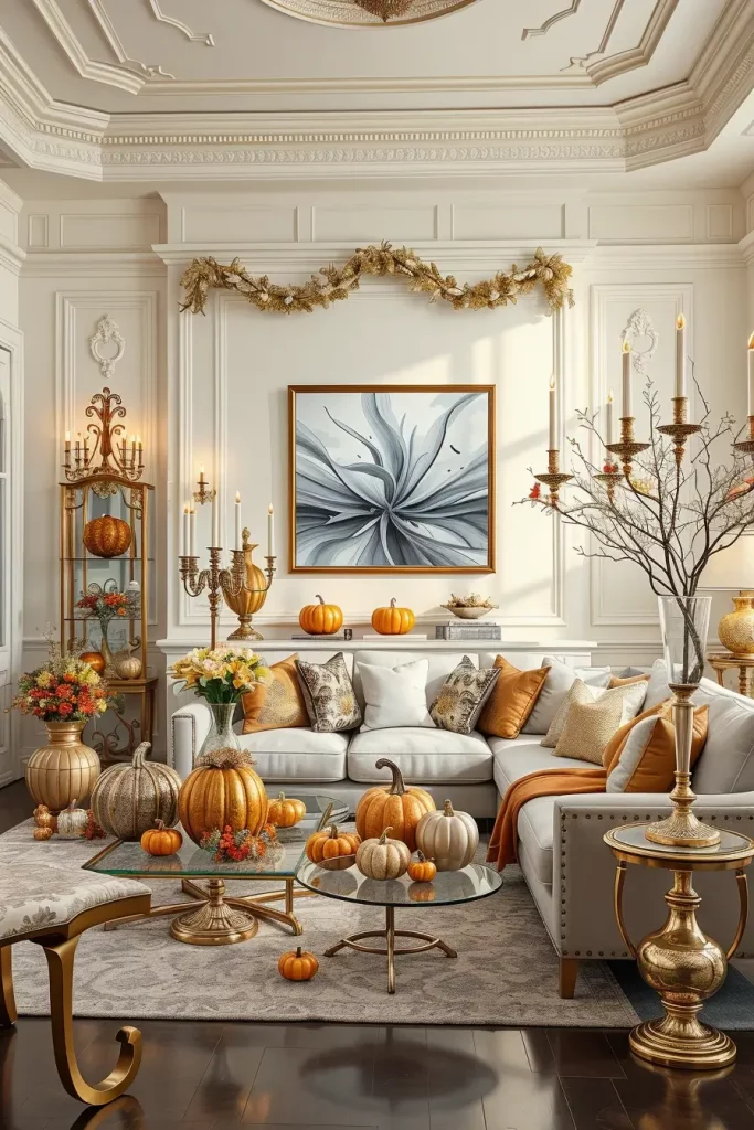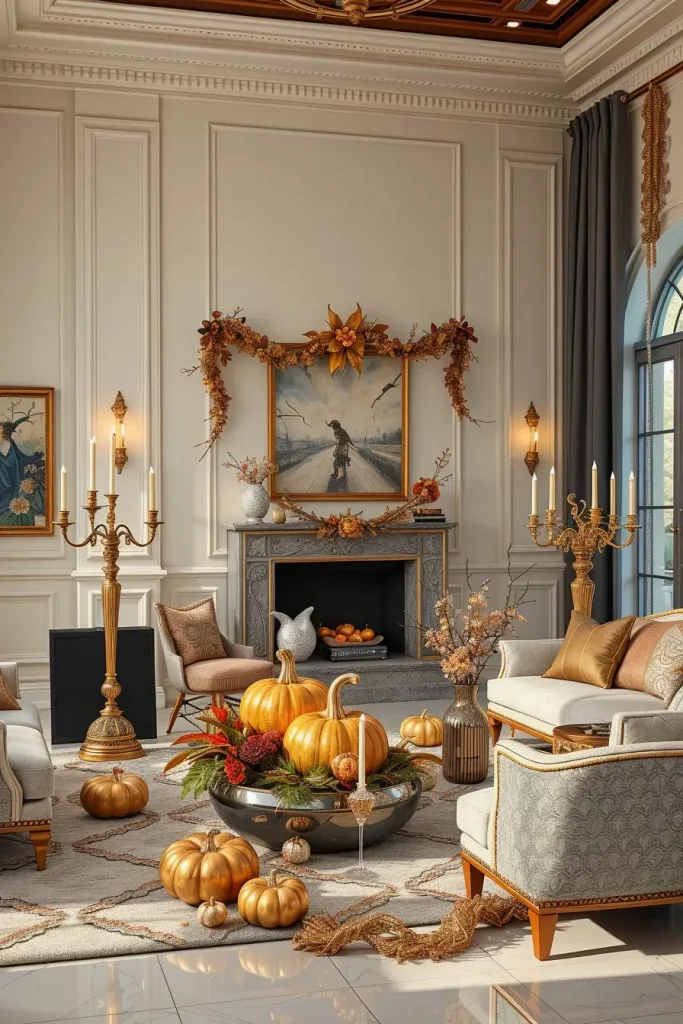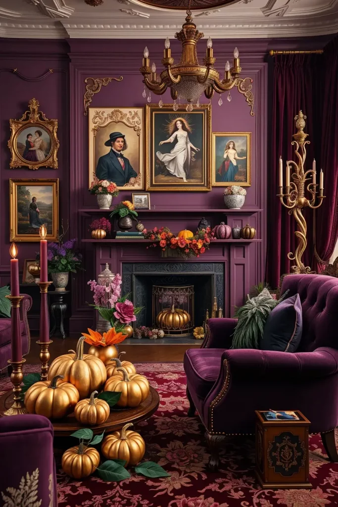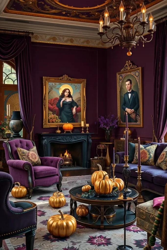 I like to use these colors in accents, e.g. a plum arm chair, or a green velvet ottoman. Next I add pumpkins sprayed in gold, dark purple taper candles and art prints with slight Halloween themes in decorative frames. Even something as simple as upholstery changes, such as changing cushion covers to fall colors, adds a lot of visual impact.