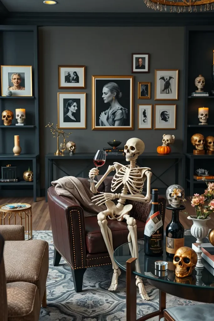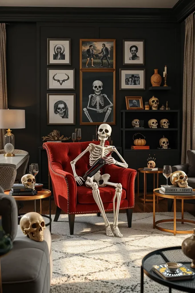 Skeletons need not be frightening, they can be stylish and have a personality. I have also used posable skeletons in life-size poses, wearing fashionable clothes or sitting in armchairs holding a glass of fake wine in my designs. These additions add humor and coziness to Halloween home decor and make the theme unquestionably seasonal.