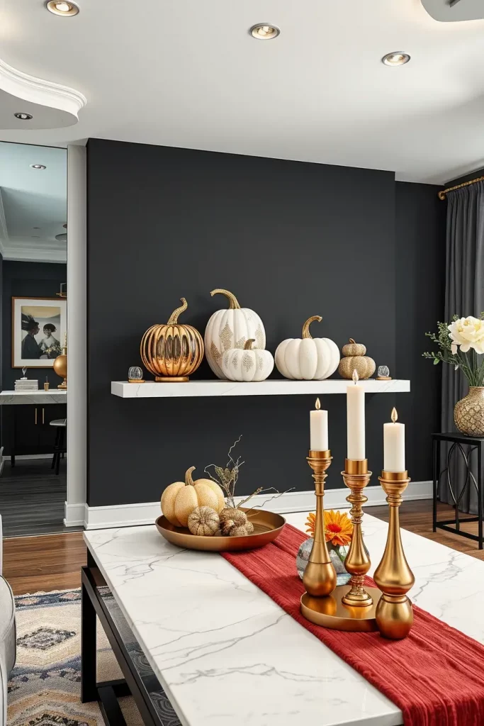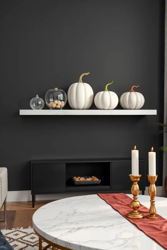 I prefer to use white or jet-black matte pumpkins on top of floating console tables or in modular wall niches in my work. I match them with brushed brass candle holders and top quality linen runners in subdued earth colors. Such decorative pumpkins are particularly beautiful on dark accent walls or smoky mirrors.
