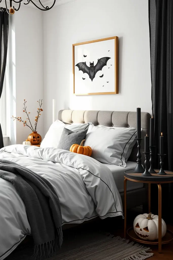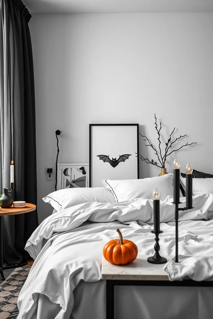 Minimalist bedrooms do not need to miss Halloween, they only require minimal and considerate details. I start with bedding, of course–switch to new white with black piping, or a duvet with a restrained Halloween theme, like little bats or crescent moons. The concept is to party without losing the minimalist look.