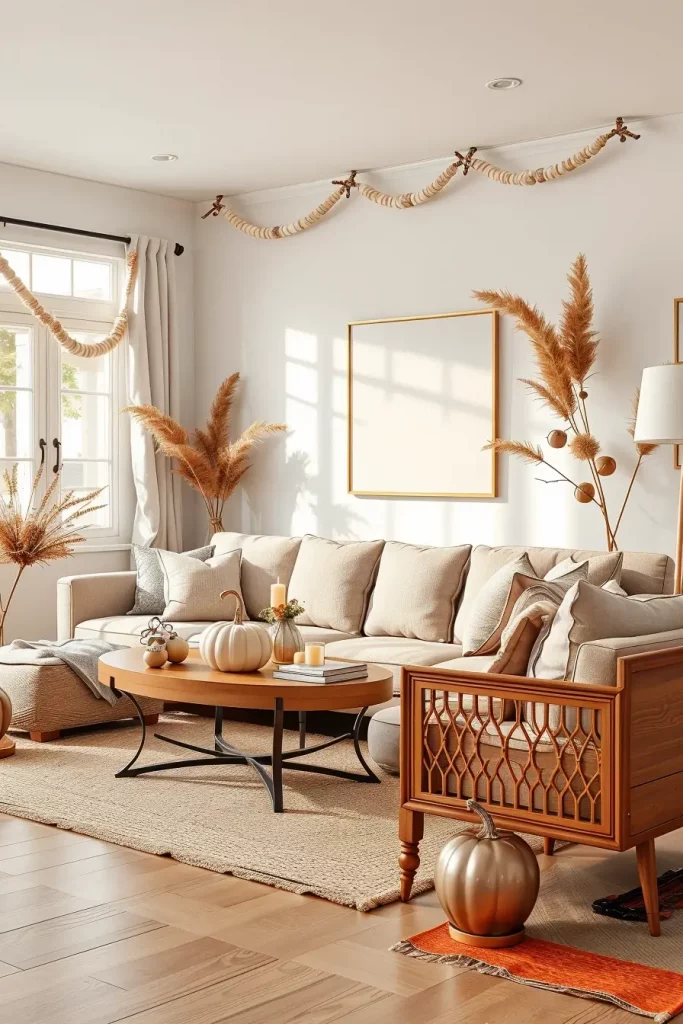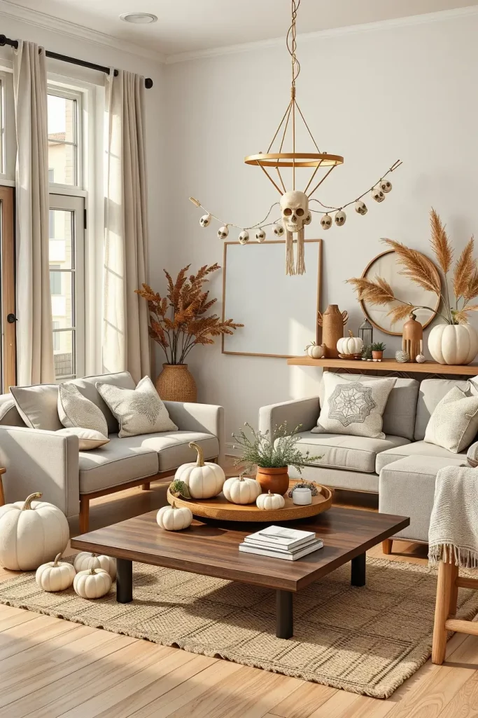 I prefer to use decor pieces that are neutral in material linen pumpkins, ivory ceramic bats, beige skulls, and hand-carved wooden ghosts. The furniture should not be too fancy, yet it is possible to add a hint of season by decorating with some accent items like macrame garlands or jute floor mats with Halloween patterns. The organic look and feel are achieved with the help of natural materials like dried pampas grass, wheat bundles or wood bead garlands.