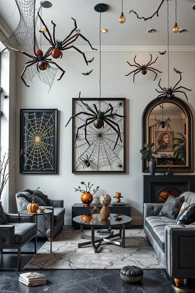 I adore matte black wire spiders that sit on mantels or creep up staircases or are in cloches. Add them to web-inspired garlands that can be hung in the corners of the ceilings or around mirrors. I love a minimalist spider chandelier as one of my favorite additions; it is an artistic element that provides both functionality and style. Pare them with neutral or somber pieces of furniture such as sofas of slate-gray or black wood shelves to produce a dramatic museum-like effect.