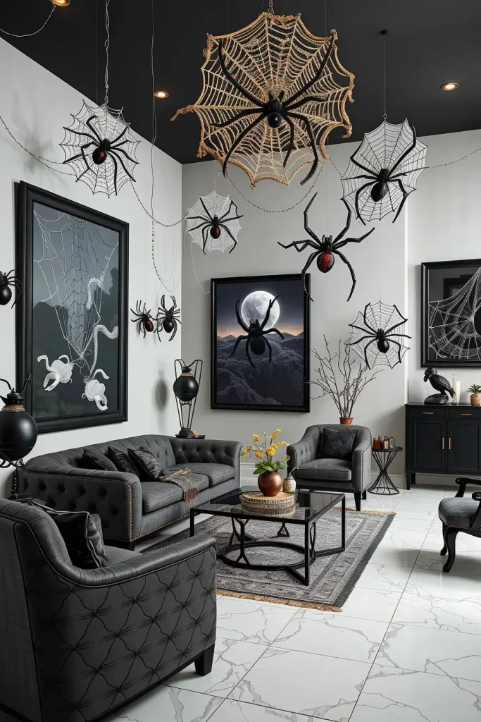Secondary in these designs is furniture. Think of low wooden benches, black and white area rugs, or an armless chaise lounge in front of a plain gallery wall. Then place in one corner a dramatic, oversized spider web, of wire or thread.