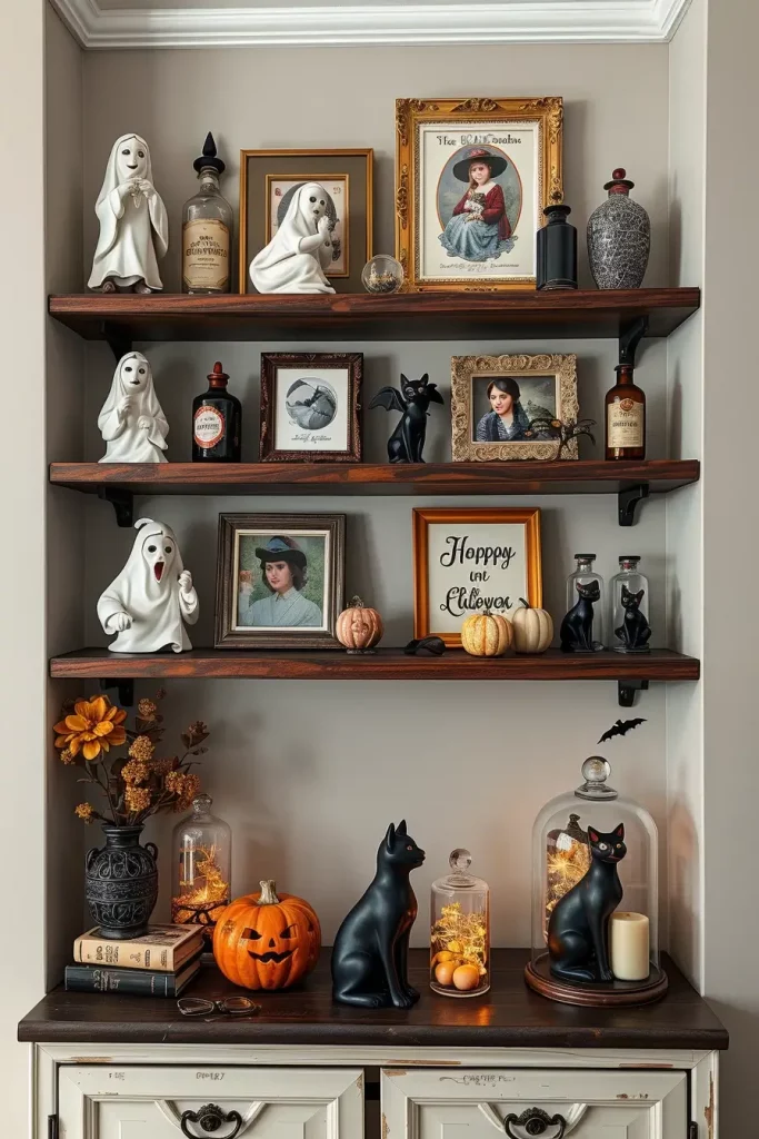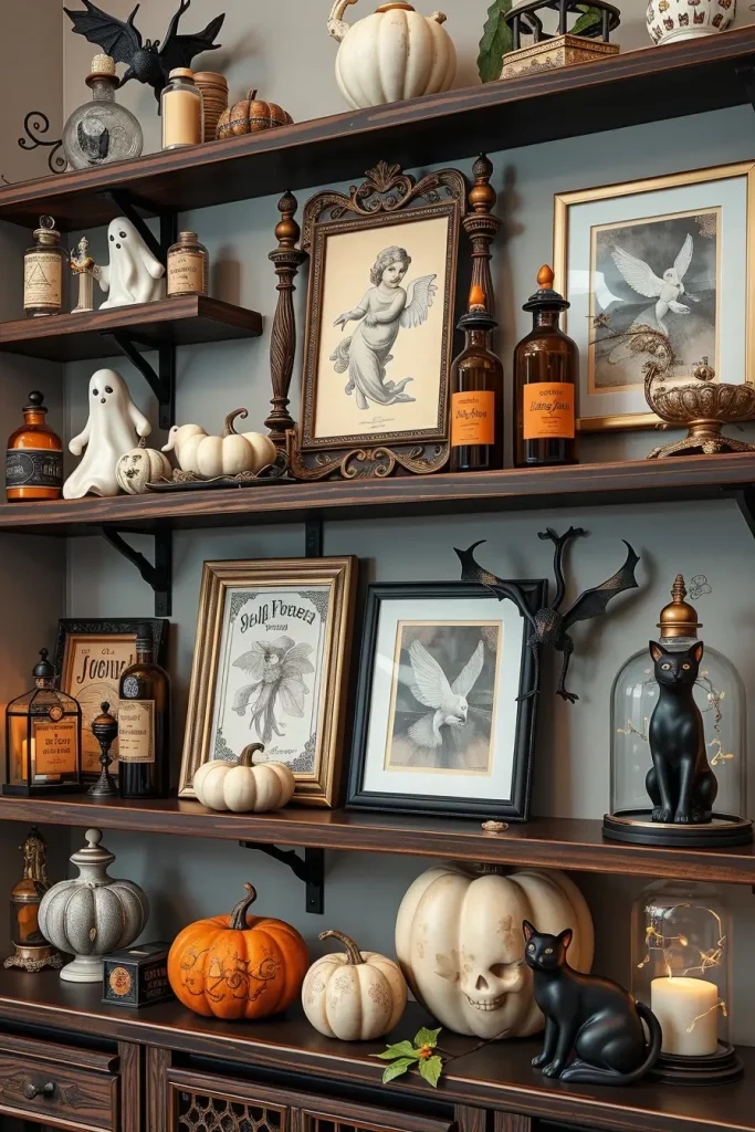 Halloween decor is a good time to show your personality and designer shelves are the best place to do it. I would say always be selective and weird- mix little and unexpected things such as ghost figurines in cloches, potion bottles and framed small prints of haunted houses or old Halloween postcards. The concept is to create a narrative on every shelf.