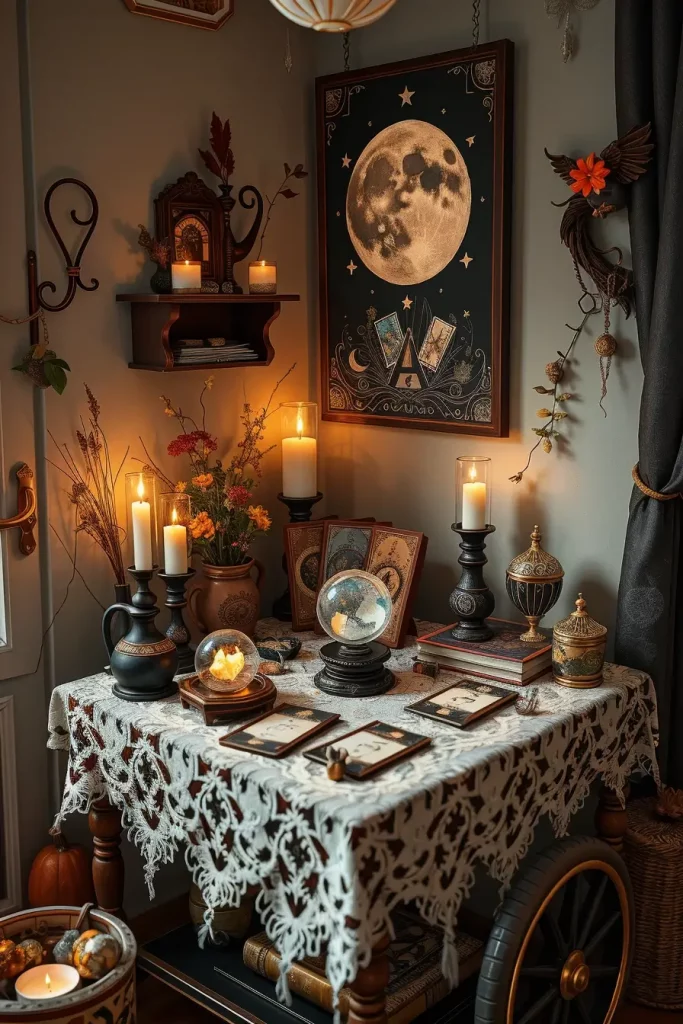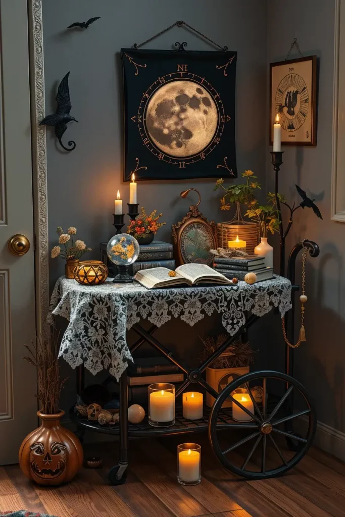 Use textural cloth e.g. lace table cloth, black doily or velvet runner. I also have a tendency to introduce ambient light with a mini salt lamp, string lights in amber colours, or LED taper candles. The wall around it can include moon phase art, framed old prints of witches, or even shelves with little vials or apothecary jars hanging on the wall.