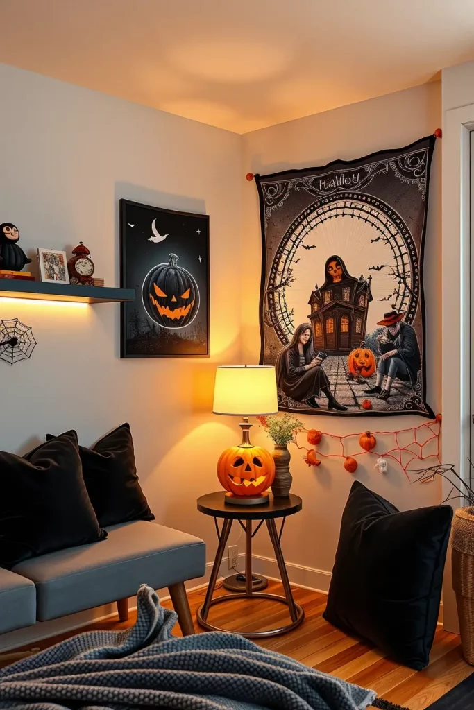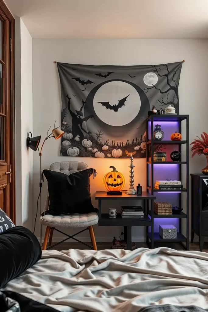 In a micro-loft I designed recently, I hung a dramatic monochrome Halloween tapestry over the bed and put a skinny console table by the window with a pumpkin lamp that glows. We added skeletal embroidery throw pillows on the bed and sofa and a black lacquered tray on the coffee table to set mini-pumpkins and candy jars. Under shelves were compact LED strip lights that provided a glow effect at night. These Halloween decorations to fit small spaces are gorgeous and functional.