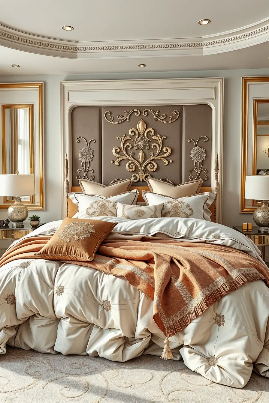 I suggest to pile Egyptian cotton sheets, silk pillowcases and oversized down duvets. Quilted headboard covers, cashmere throws and velvet cushions are rich. Neutral tones are still popular, whereas metallic embroidery and texted patterns are the new trends.