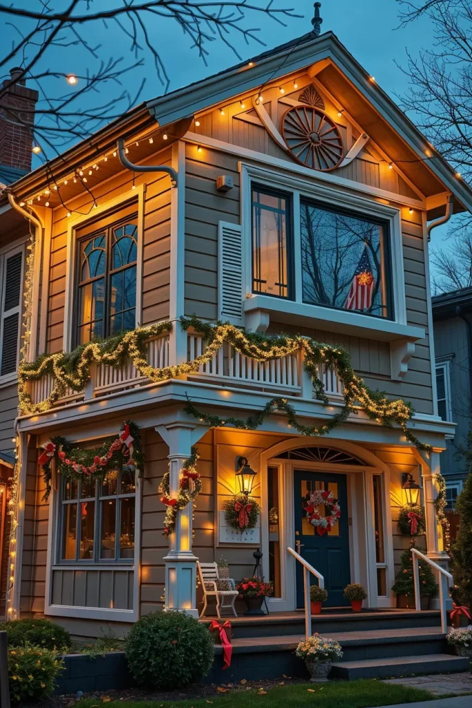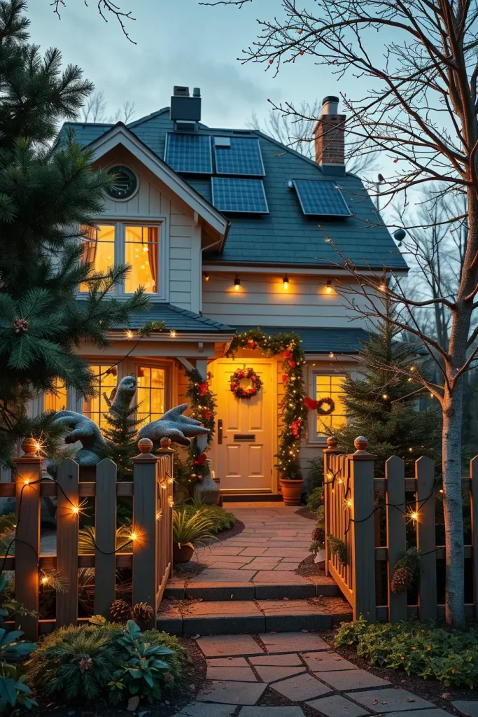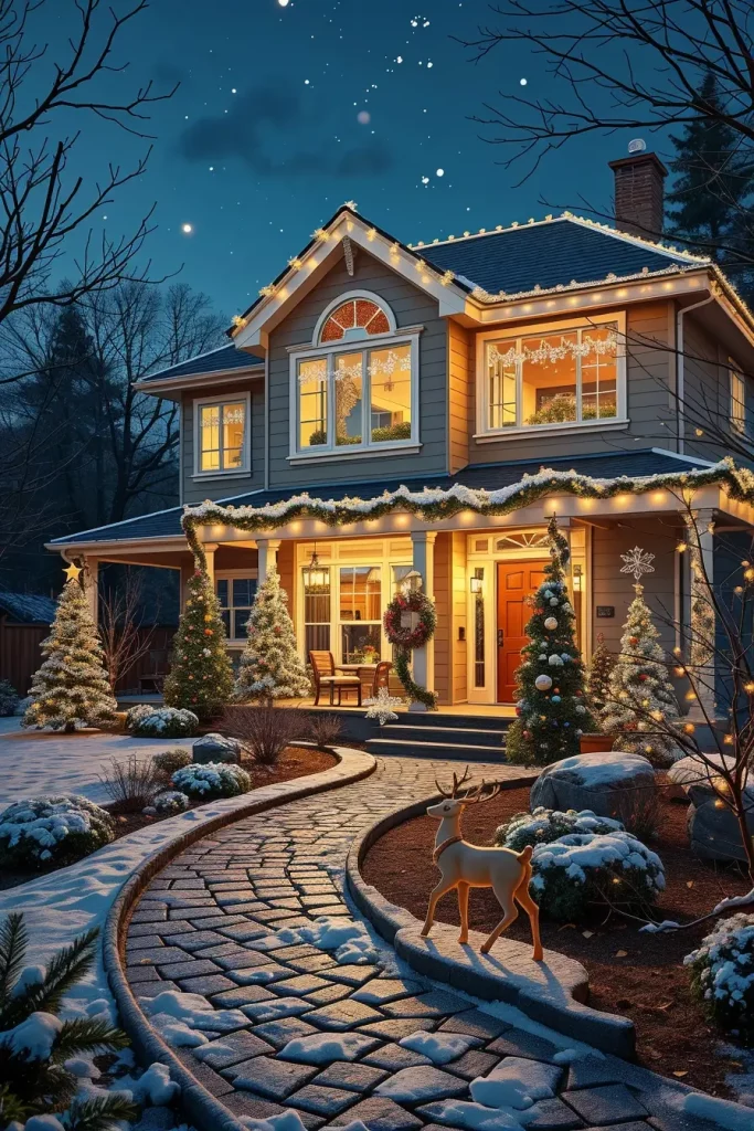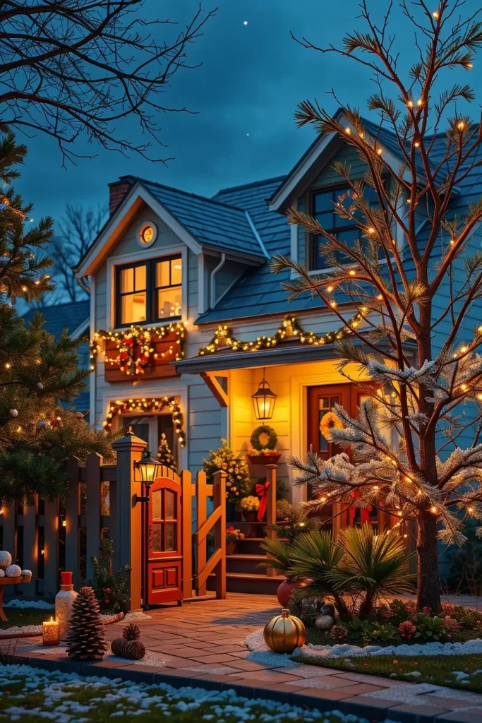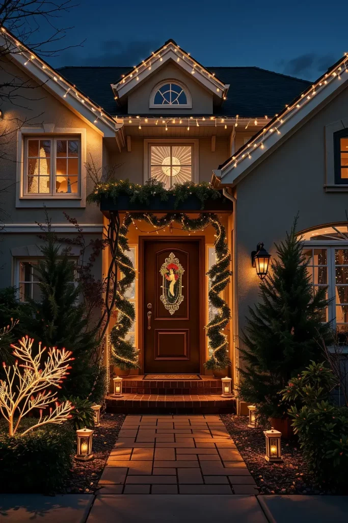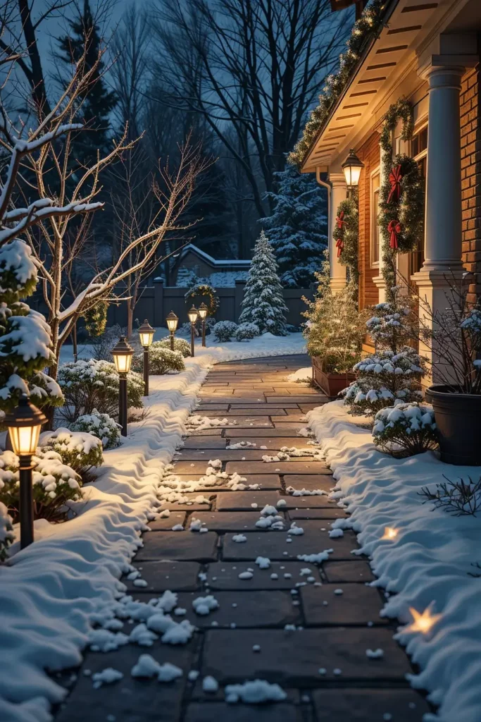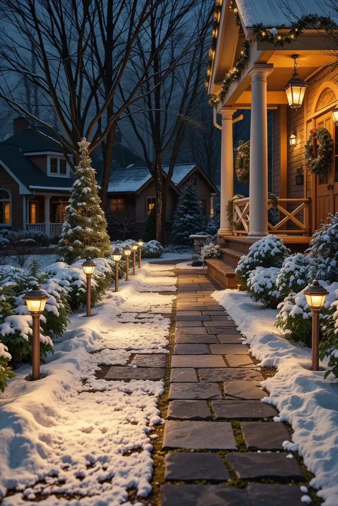 In the development of this composition, I would choose soft white or golden colors, which are in harmony with snowy landscapes and natural stone paths. Ornamental lantern-effect lighting systems or low garden spotlights will be used to add a classy style without making the setting too open. Making them be mixed with outdoor garlands or wreaths makes them have a unified appearance that unites the whole exterior.