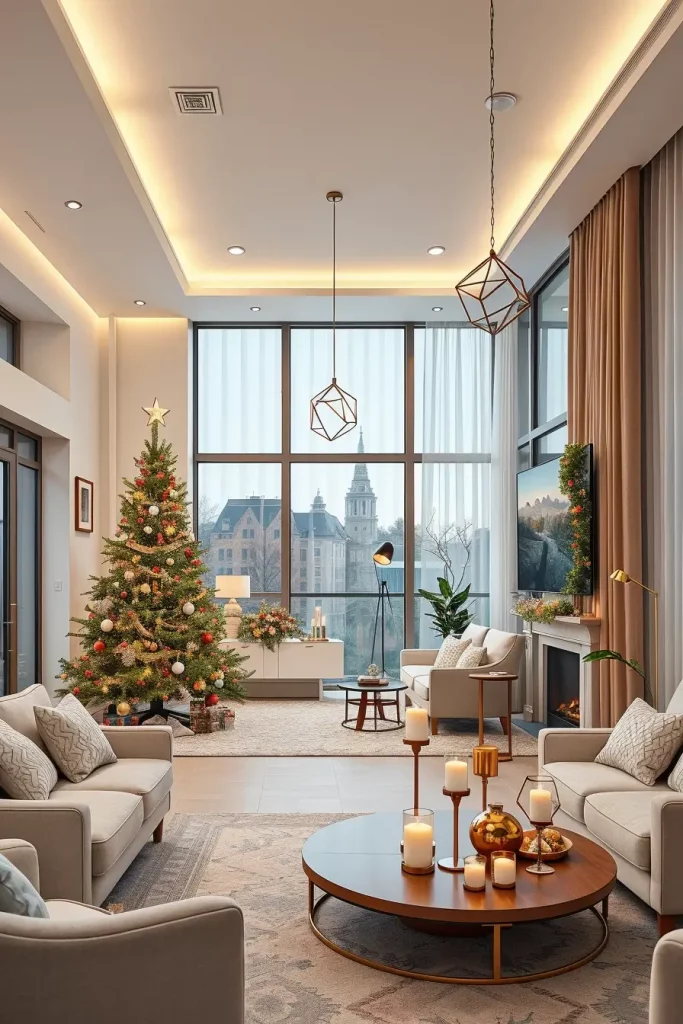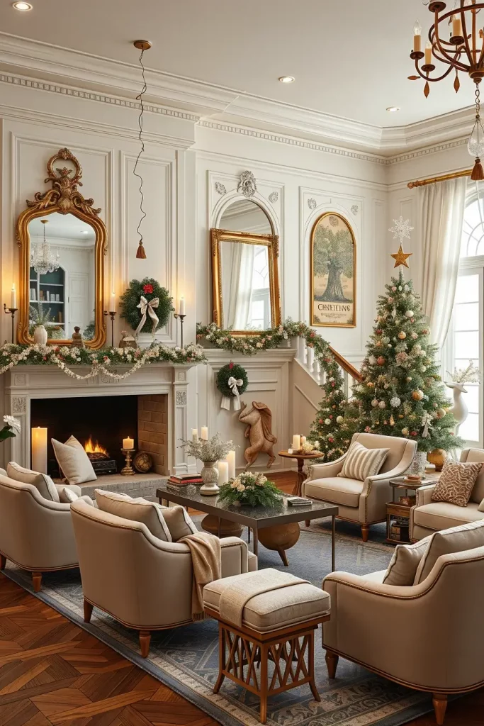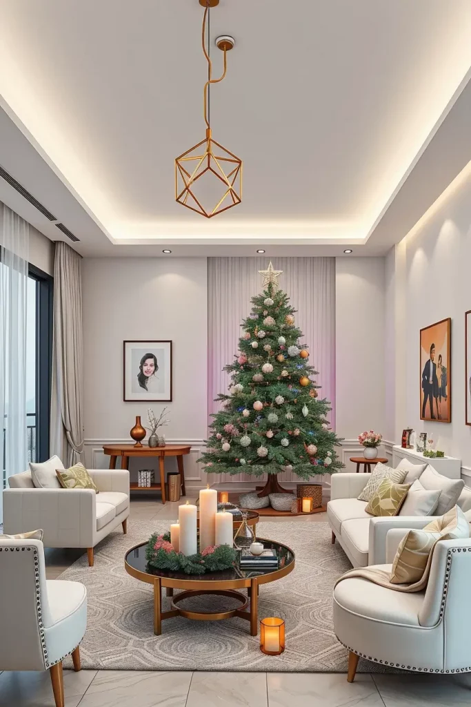 The utilization of the holiday chandeliers and hanging light ornaments is also among the most notable trends of 2025. These make such a beautiful vertical feature, to be used in dining rooms or doorways. I am fond of mixing metals finishes and cozy bulbs and adding little mirrored hotel details that resemble snowflakes.
