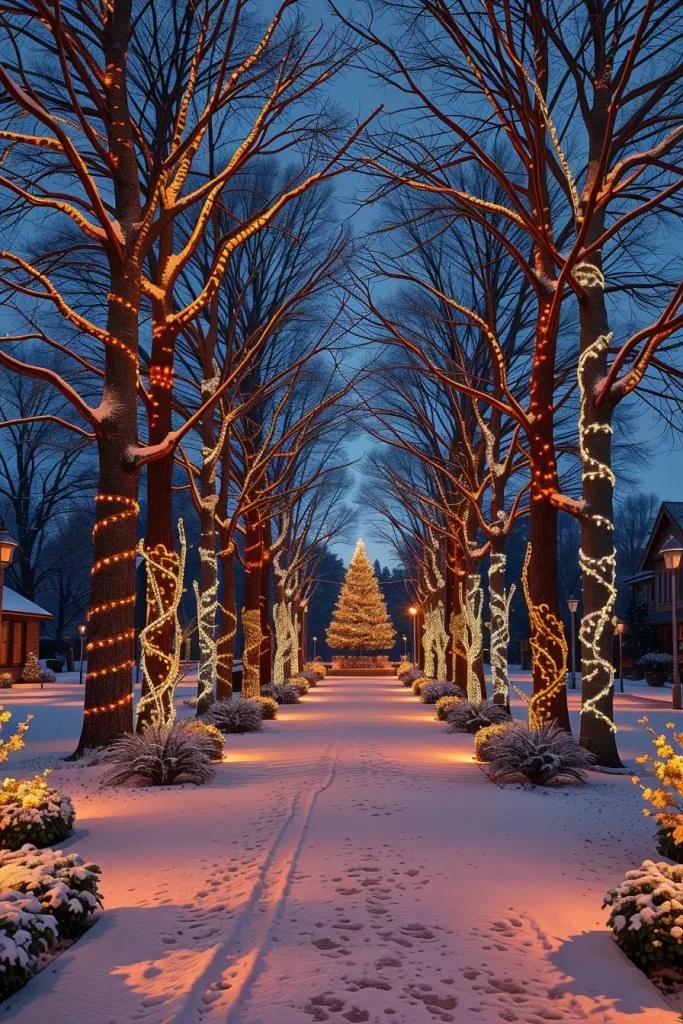 Wrapping lights around the trees is an art and in 2025, perfection will be all that matters. I begin at the bottom and make lights spiraling upwards with a regular distance between them to highlight the natural arrangement of every branch. In case of evergreen trees, warm white LEDs are my choice to use because they give an evergreen an everlasting look; in bare trees, the combination of cool white and gold colors makes the winter picture look more magical.