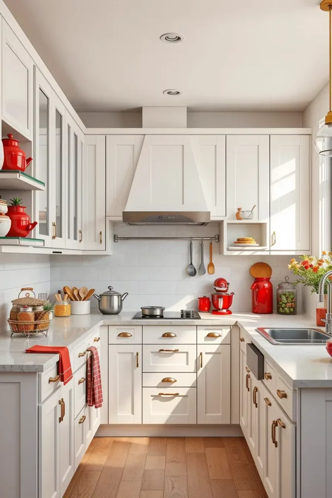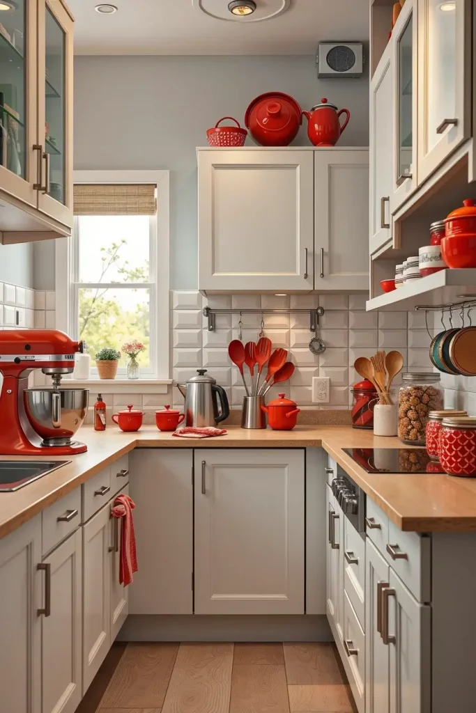 Accessories are usually underrated but they can totally transform the feel of a kitchen. Red countertop accessories, including small appliances, utensil holders, or decorative jars, are a cost-effective and convenient solution to add color to the room. I have found that these touches in my work can be used as conversation starters with guests.