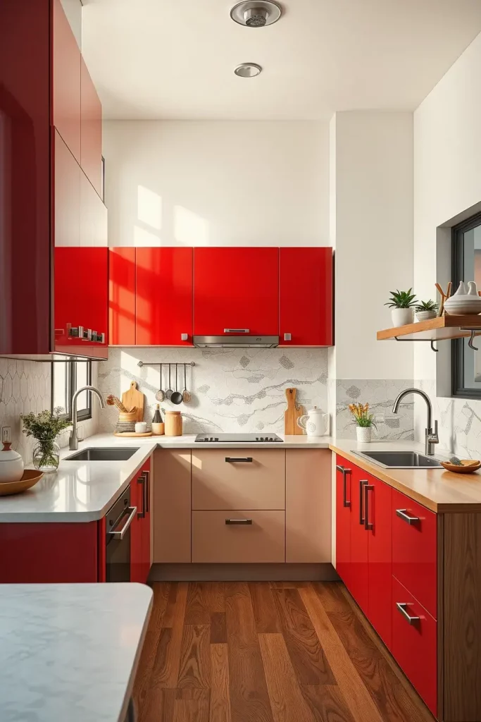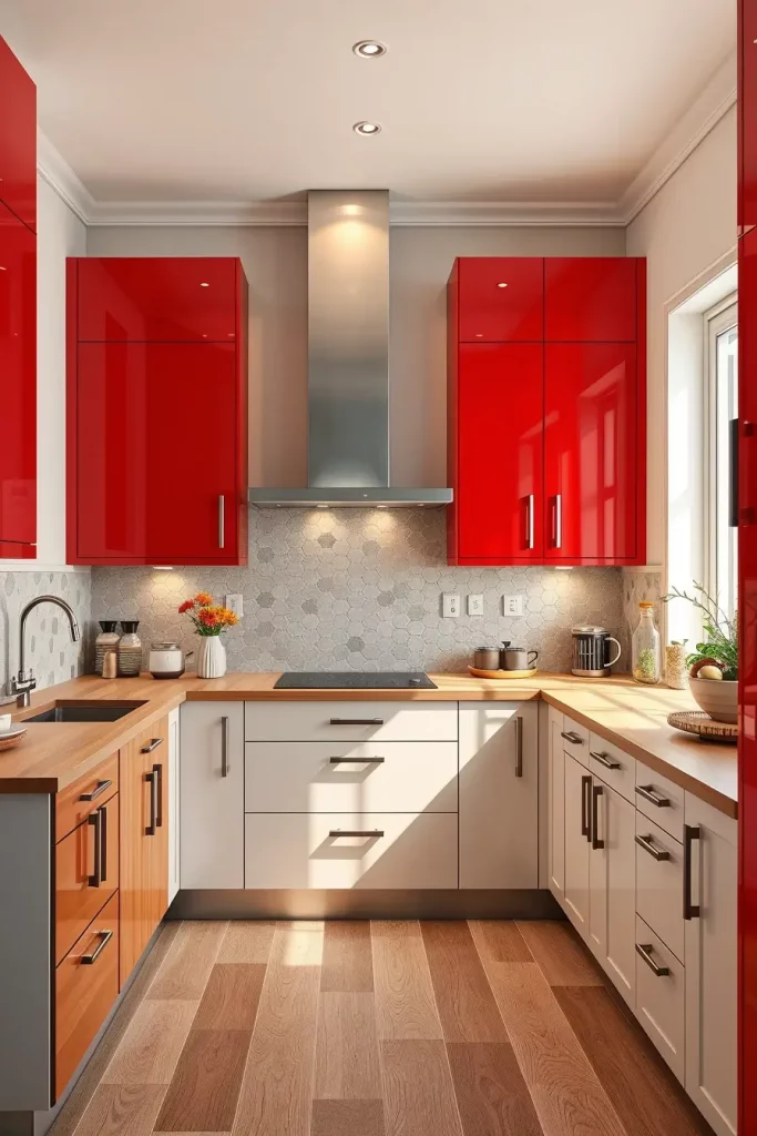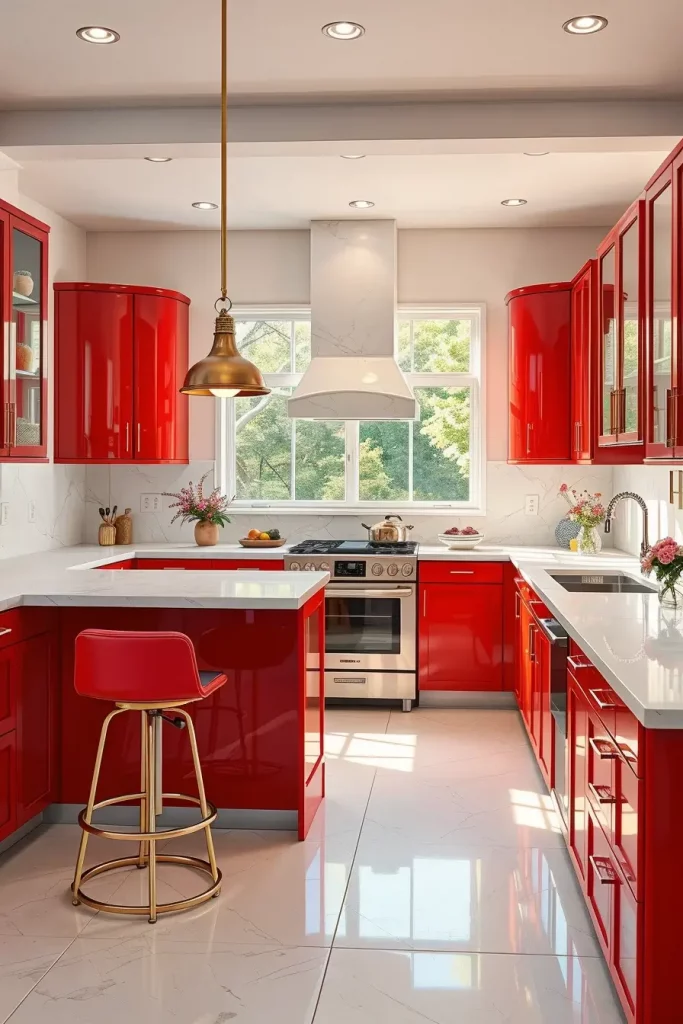 I personally have always loved the way high-gloss red finishes reflect light and make the space appear larger and more glamorous. House Beautiful has emphasized that glossy finishes are not only sleek-looking but are also simpler to clean- a detail that is crucial to busy kitchens.