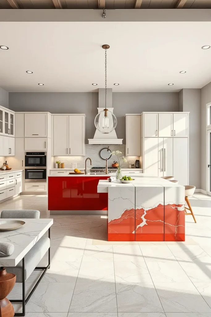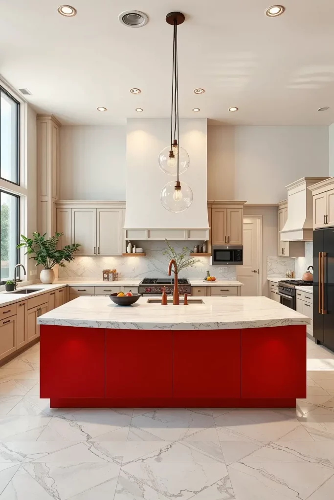 In my experience, red accents in large kitchens allow homeowners to add personality without being too much to handle smaller details. Architectural Digest has emphasized that powerful focal colors are vital in large, open designs and red is one of the most powerful ones.