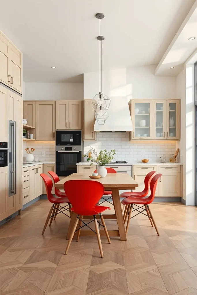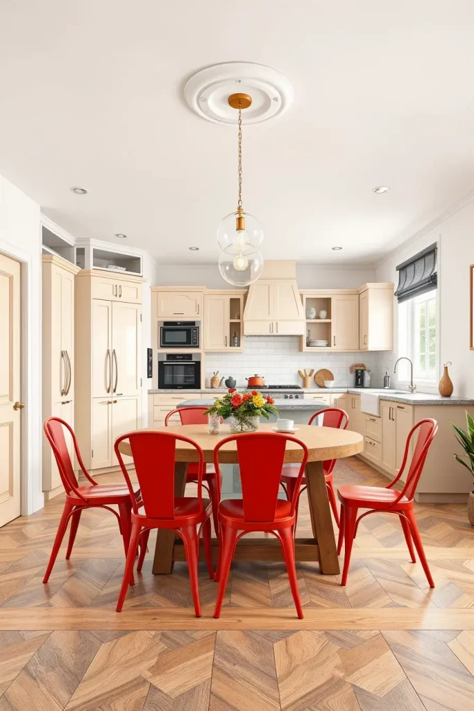 I have frequently employed red dining chairs in my practice to add color to kitchens with a more neutral color scheme. Chairs are a convenient method of trying out daring shades, and in open kitchens they aesthetically connect the dining room to the kitchen. Chairs of bright red color attract attention at once and make the atmosphere welcoming and full of energy.