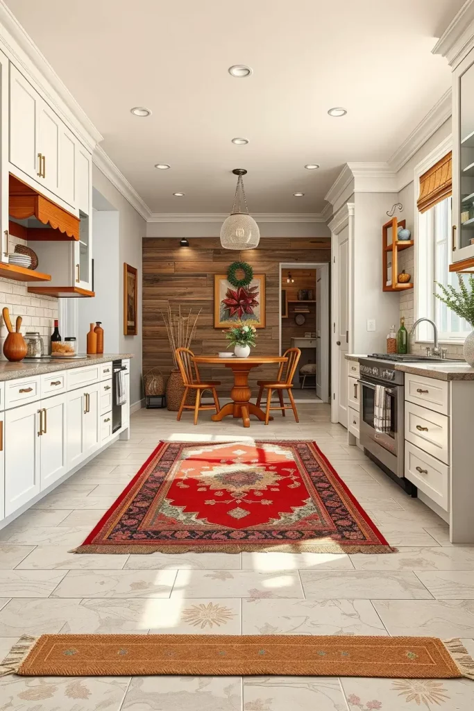 To enhance this area, I would include the concept of matching the rug with countertop decor or dining chairs to have a unified design flow throughout the kitchen.
