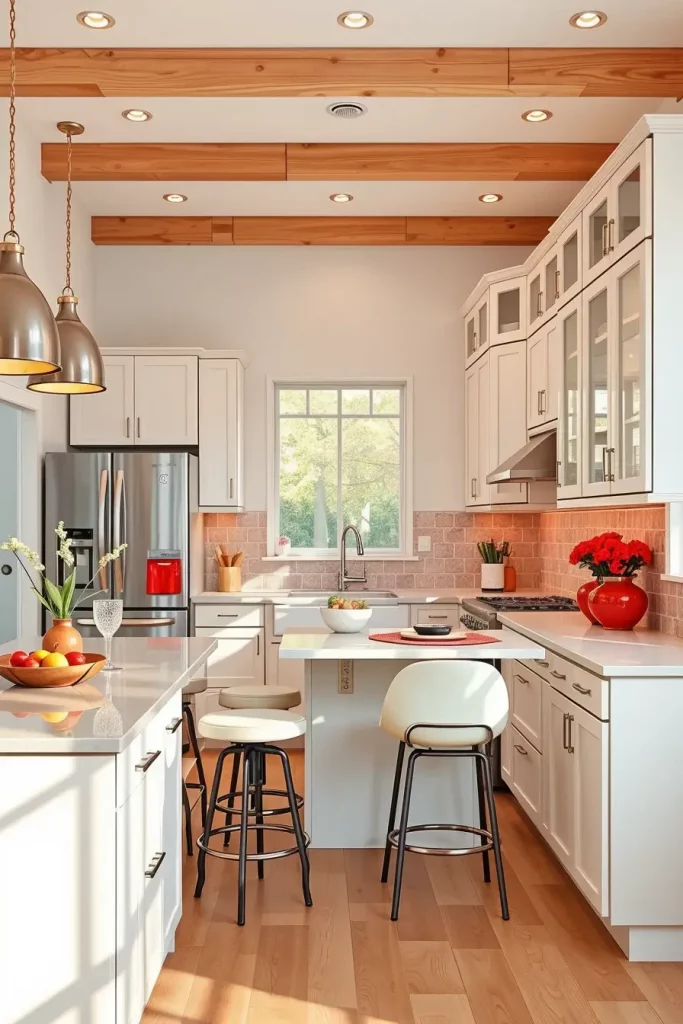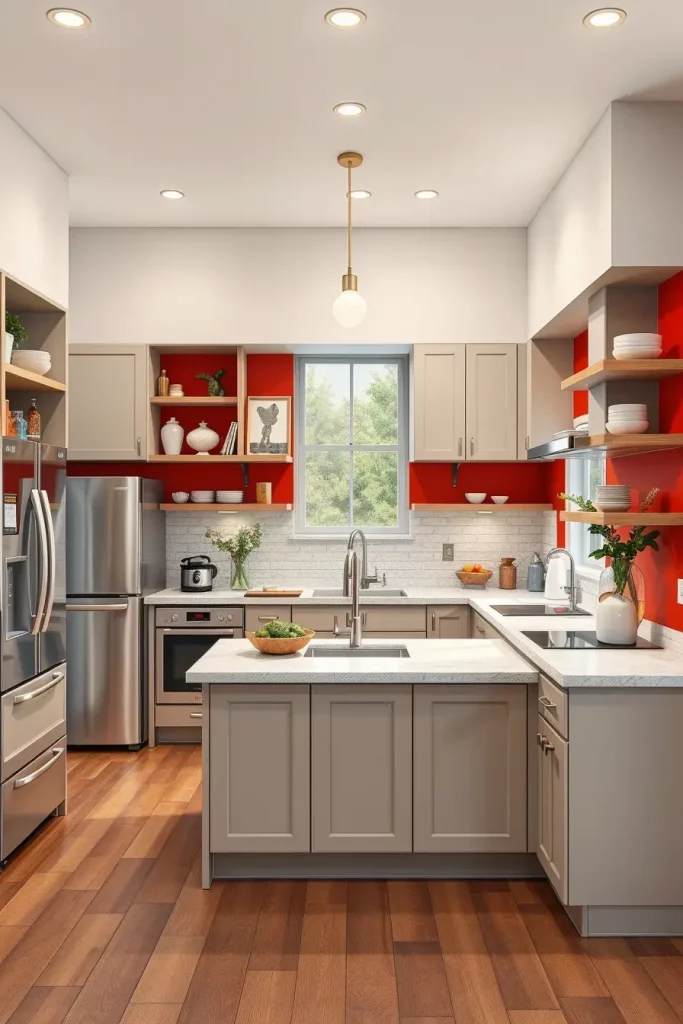 I tend to add red islands, red pendant lighting or even a red feature wall in these designs to anchor the space. The red is balanced with white or gray cabinetry to make the kitchen dynamic. The open-plan layout can also be improved with the help of open shelving with red details.