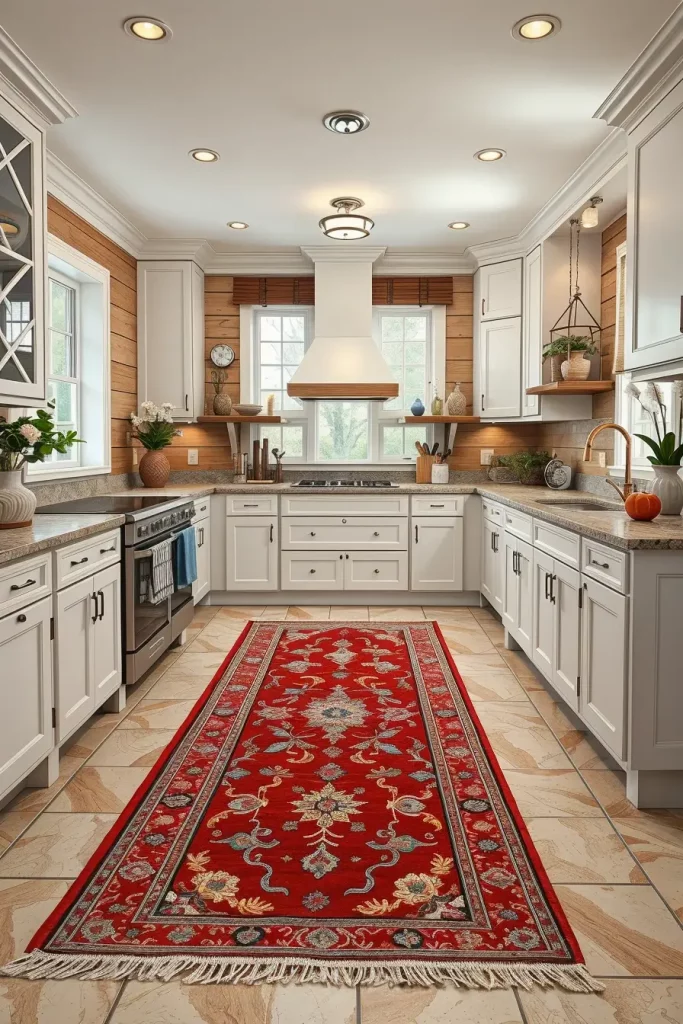 In selecting rugs, I would suggest washable or stain-resistant fabrics because kitchens are heavily trafficked. Red-toned Persian-style rugs can be used as a touch of elegance, and plain red runners can introduce vitality and functionality to the narrow galley kitchens.
