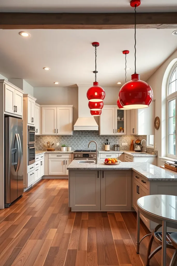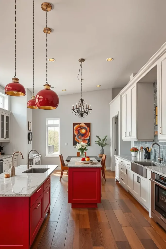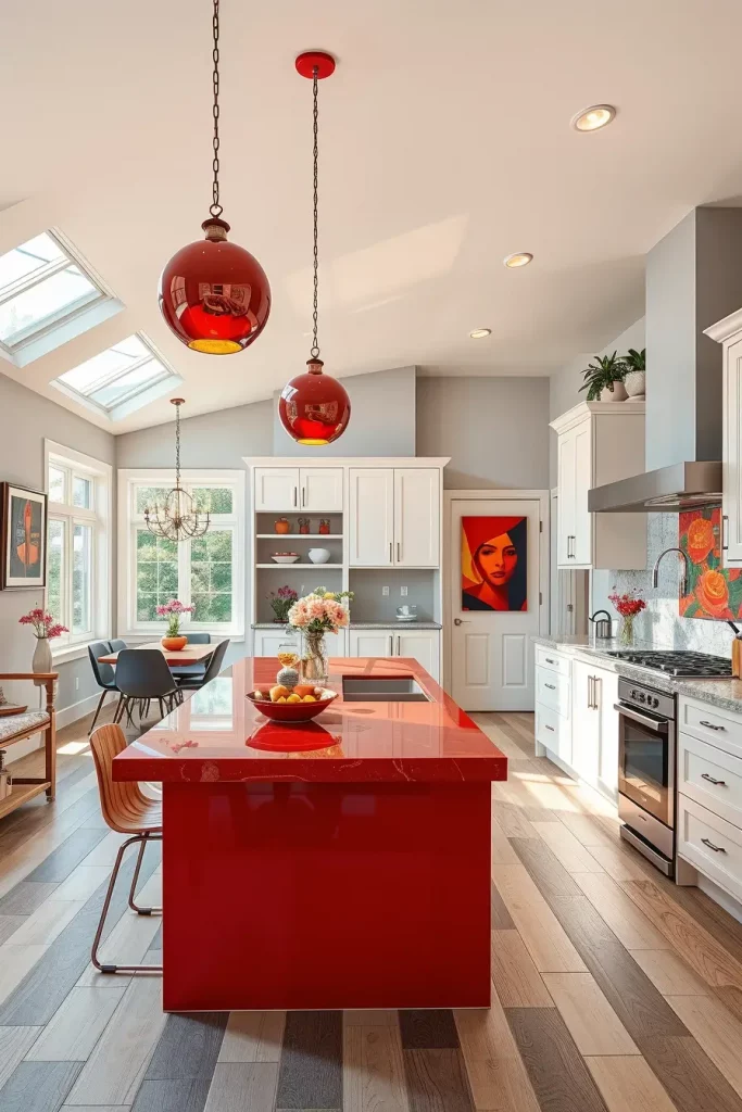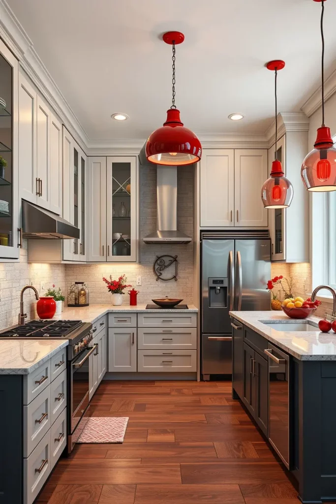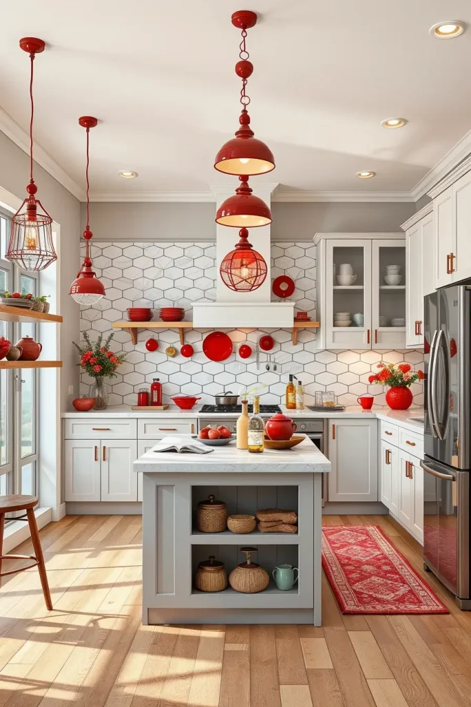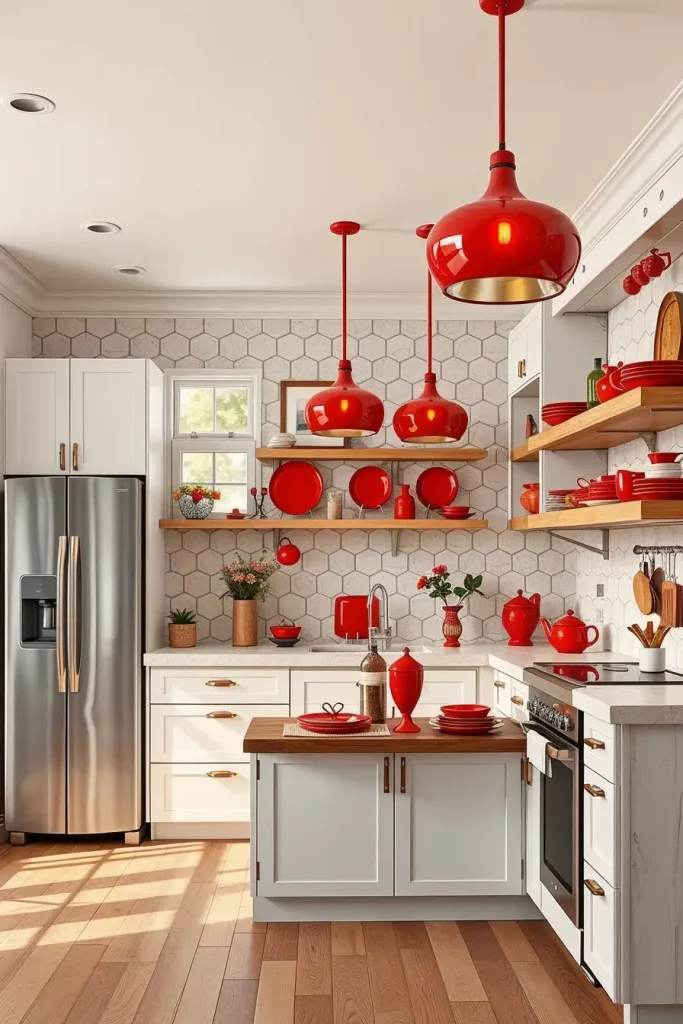 Lighting is a big part of kitchen design and decorative red lighting fixtures are one of my favorite ways to add personality. Glossy red pendant lights can be suspended over an island or a dining space and make a striking focal point that is both functional and chic.