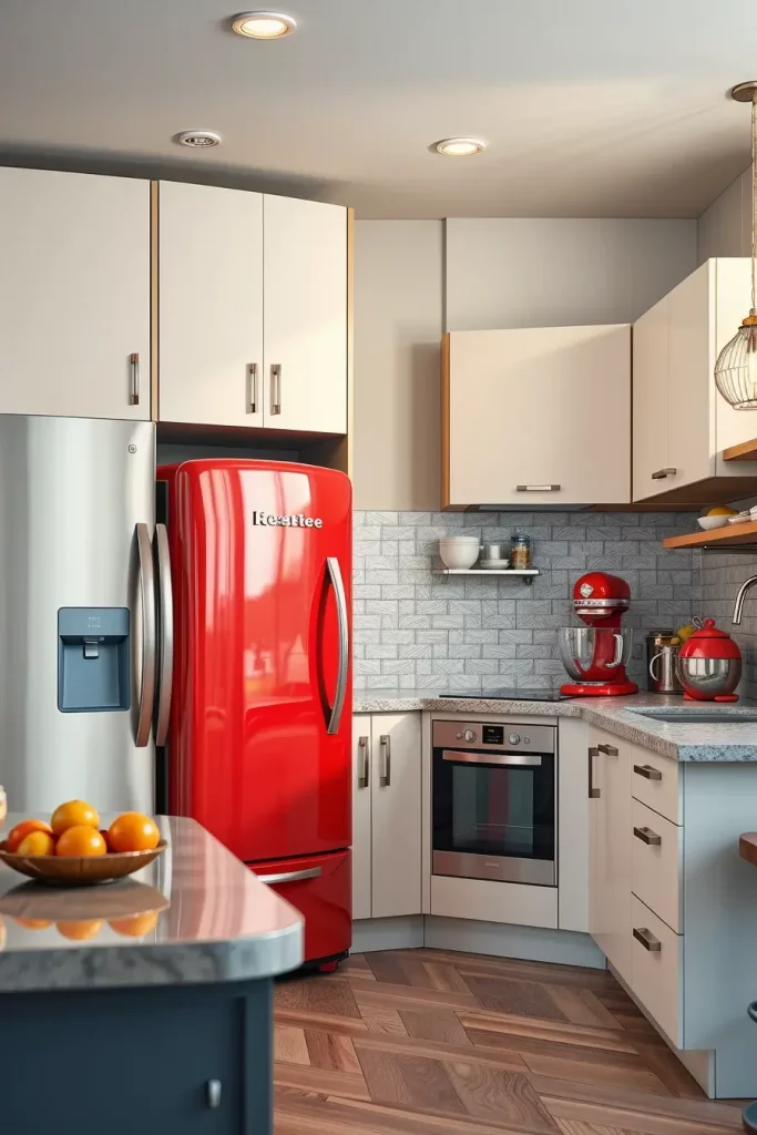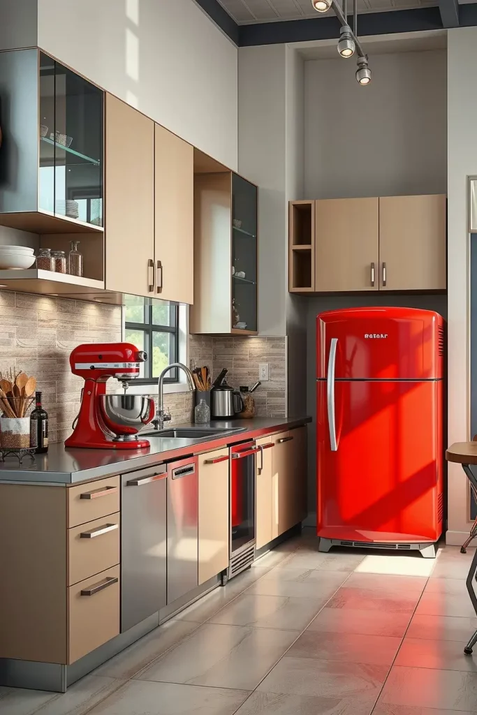 I would choose something good such as a red stand mixer, a bright kettle, or even red-lidded glass jars. These items are not only functional, but they also make the kitchen more personal. They can be updated or replaced easily and are thus a versatile design solution.
