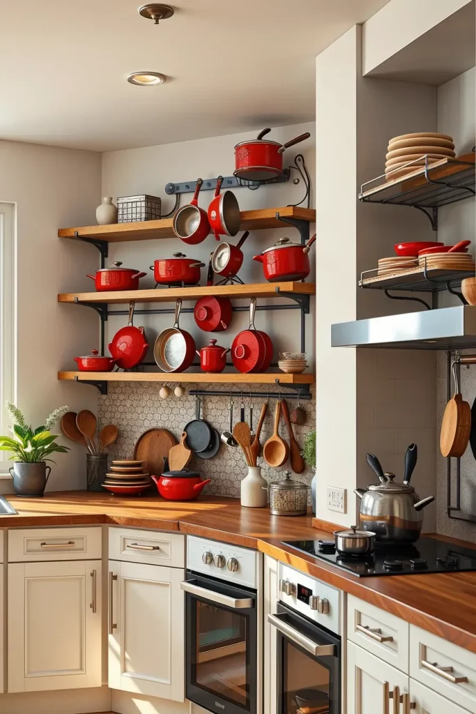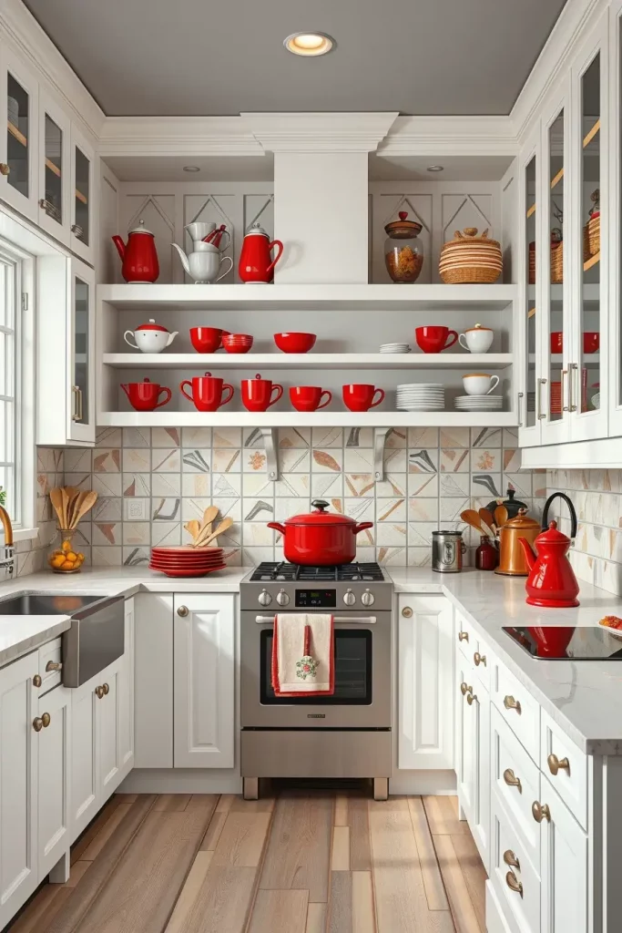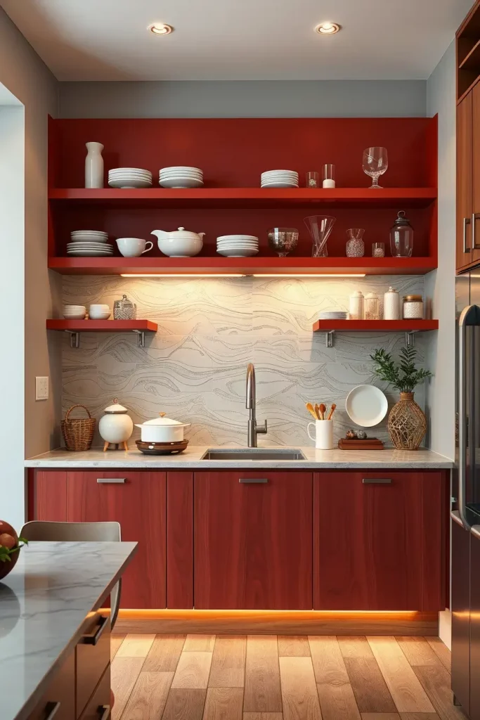 Personally, one of the most impressive methods of adding bright red accents to the kitchen is red open shelving. It does not only add visual interest but also makes items that are used daily easily accessible. I think that this method works especially well in contemporary or transitional kitchens where the functionality is as significant as the design. The first thing that catches the attention is the open shelves that give a sense of order and style.