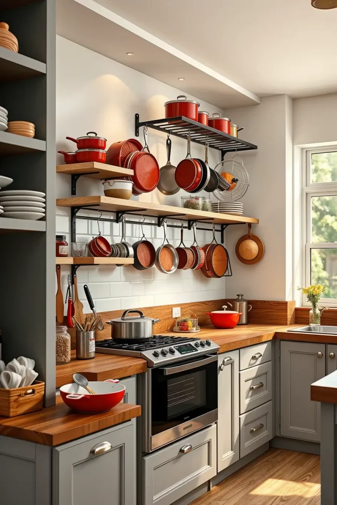 Another good idea to add bright red accents to the kitchen is cookware. Red pots and pans hanging on a wall rack or on an open shelf become functional art. I have observed the way clients like this method as it helps to emphasize their character and still makes tools available.