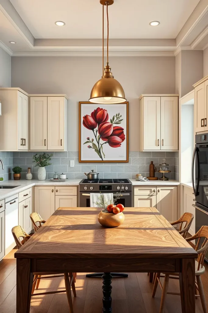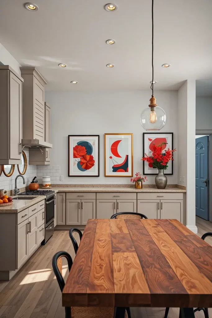 I tend to choose art that will work with the rest of the color scheme. As an example, a print of red fruits or abstract red shapes can be used to create energy without conflicting with cabinetry or countertops. It is a flexible kitchen decoration that fits in both small and large kitchens.
