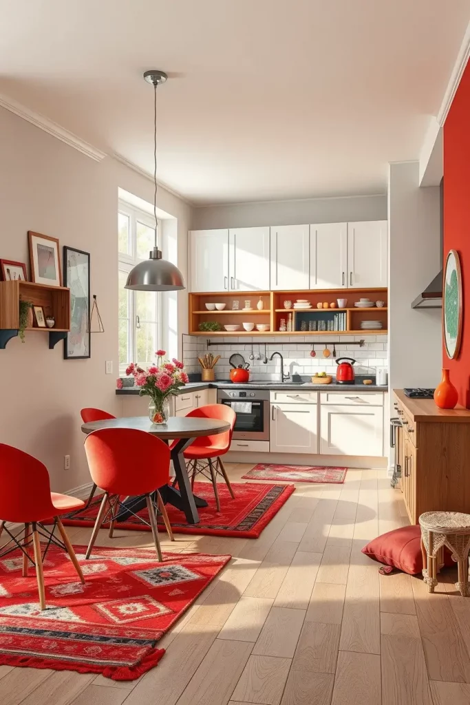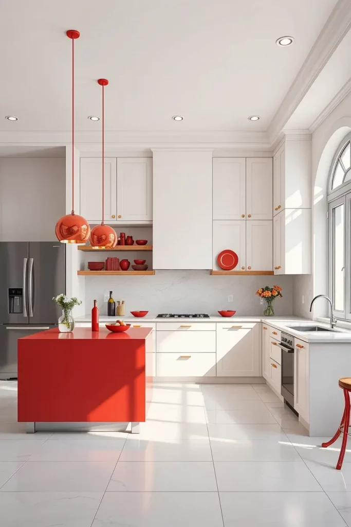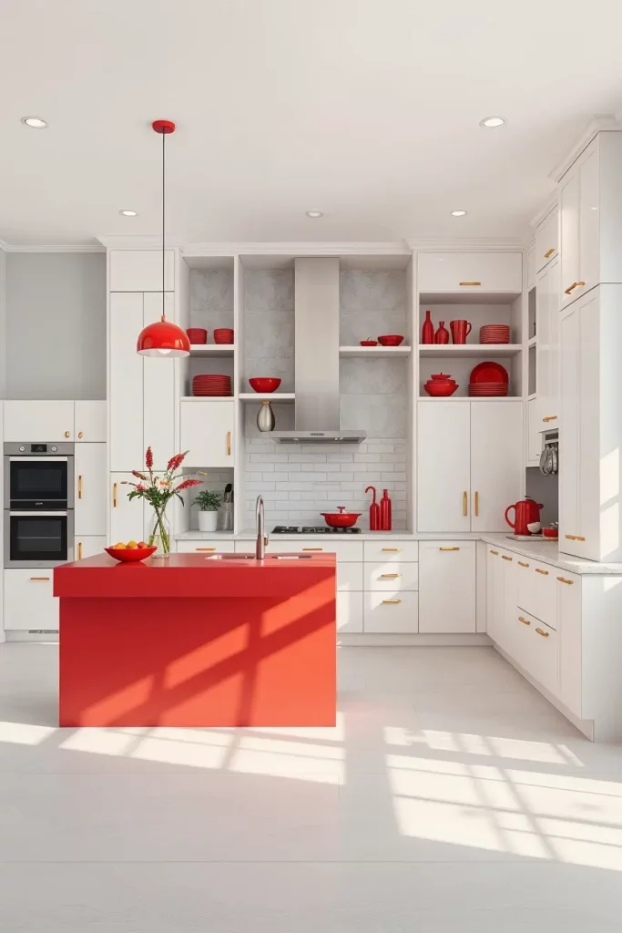 I tend to place a single red island or red pendant lights in minimalist kitchens. Open shelves and thoughtfully-placed red dishes or a dramatic red backsplash against otherwise neutral cabinets make an elegant but dramatic statement. The red is a deliberate design, not a distraction.