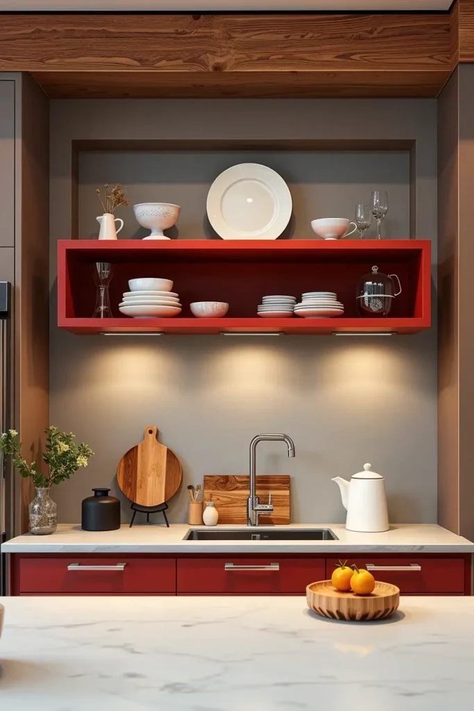 When I am designing using red shelving, I prefer to combine it with neutral walls or cabinetry. This enables the red to pop without dominating the whole place. The contrast of white dishes, clear glasses or even natural wood bowls on the red shelves is breathtaking. I usually suggest a matte red finish to get a more subtle look and glossy finish in case the clients desire a more dramatic effect.