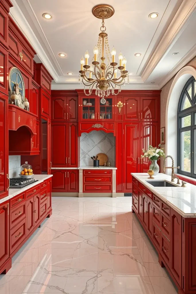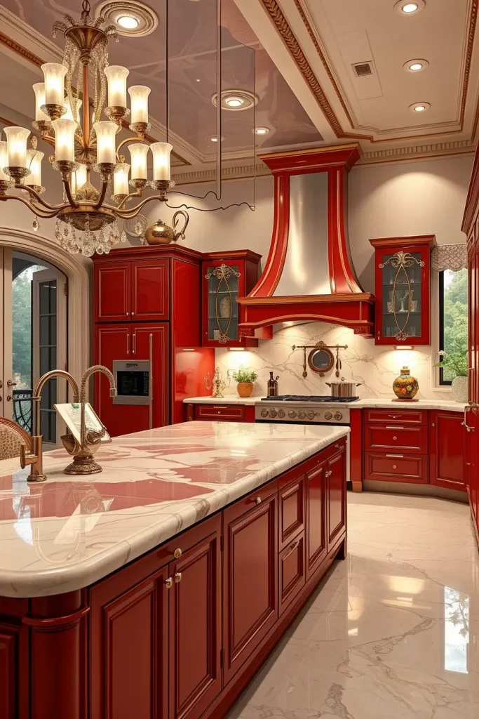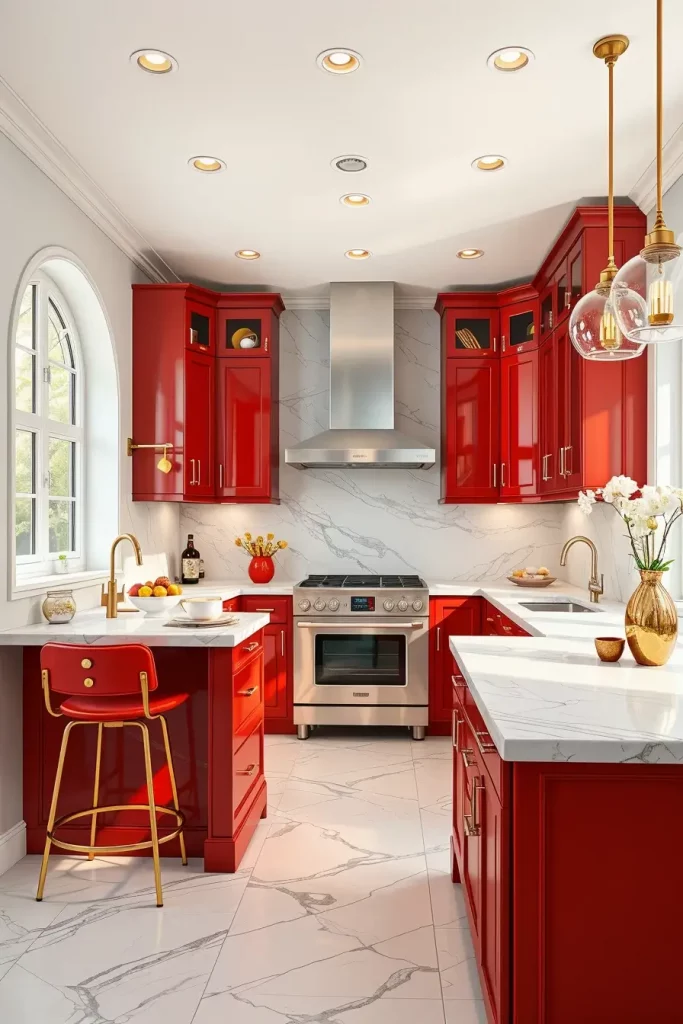 Red cabinetry with high gloss and marble countertops and metal fixtures give it a high-end look. Red high-gloss islands or lacquered are also central showpieces. I think this combination suits modern or luxury kitchens when the effect of drama and elegance is sought.