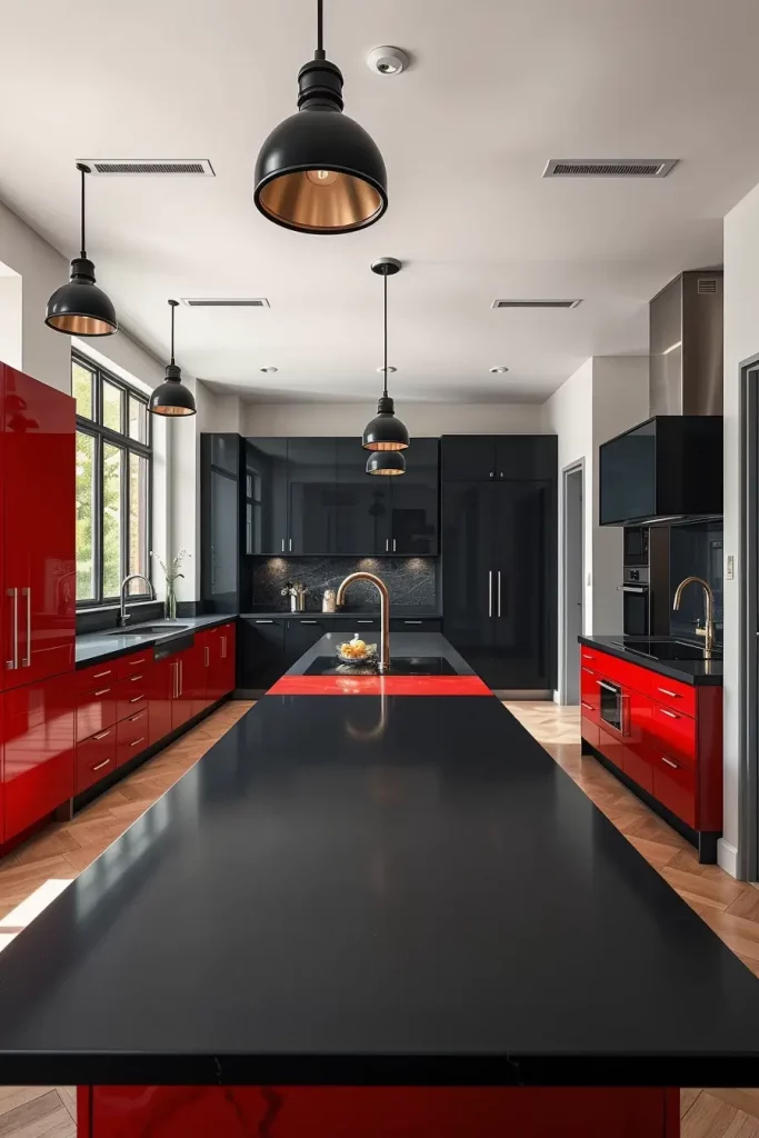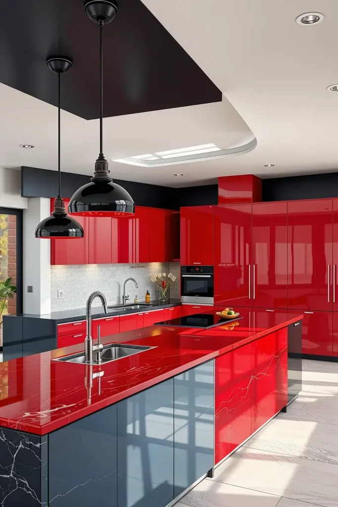 I discover that glossy red cabinets in combination with matte black countertops or backsplashes make a beautiful contrast. Black pendant lights over a red island or black-framed open shelving on red walls are also breathtaking. The trick is to maintain surfaces smooth and finishes of high quality.