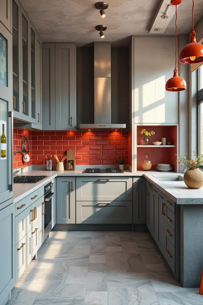 Gray cabinetry with red bar stools or a red backsplash is a common combination that I use when working with this combination. Gray concrete countertops with red pendant lighting over the island are also modern. The gray is soft enough to enable red to glow without dominating the room.