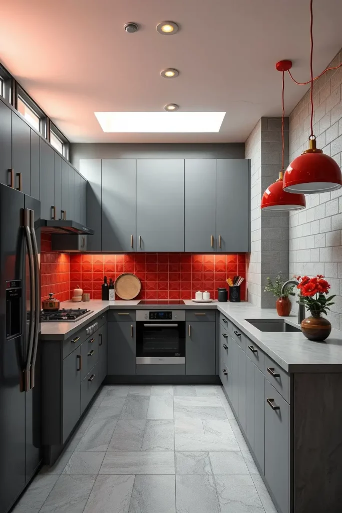 To people who prefer modern style but not too contrasting, red and gray make a balanced contemporary combination. Gray, in my opinion, softens the bright red accents, so the design is friendly and stylish. It is ideal in open-plan kitchens or city apartments where style is important.
