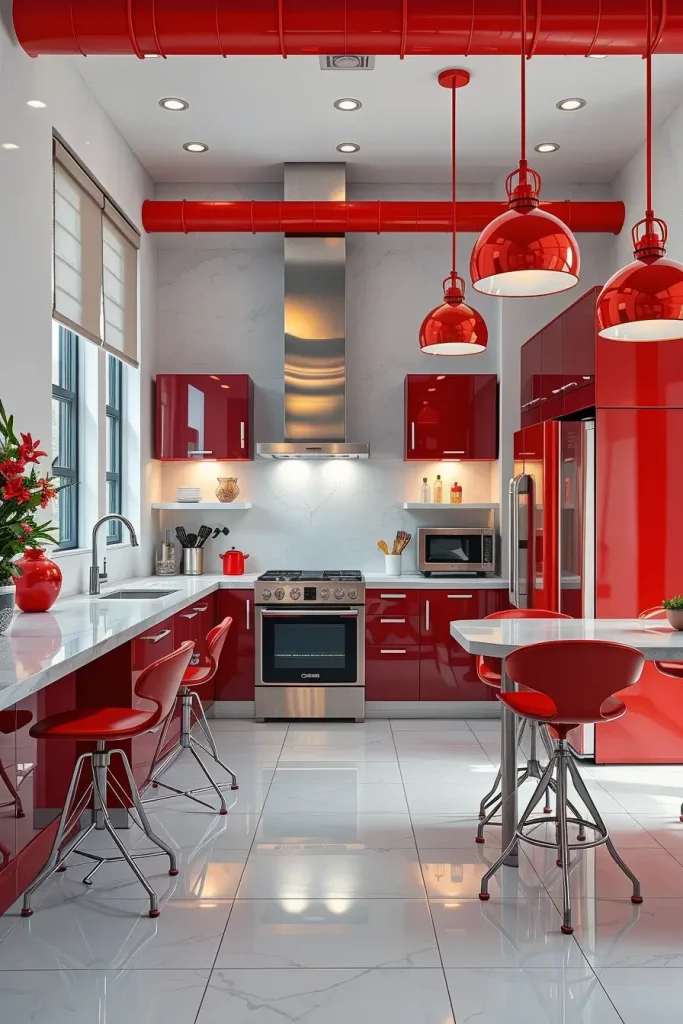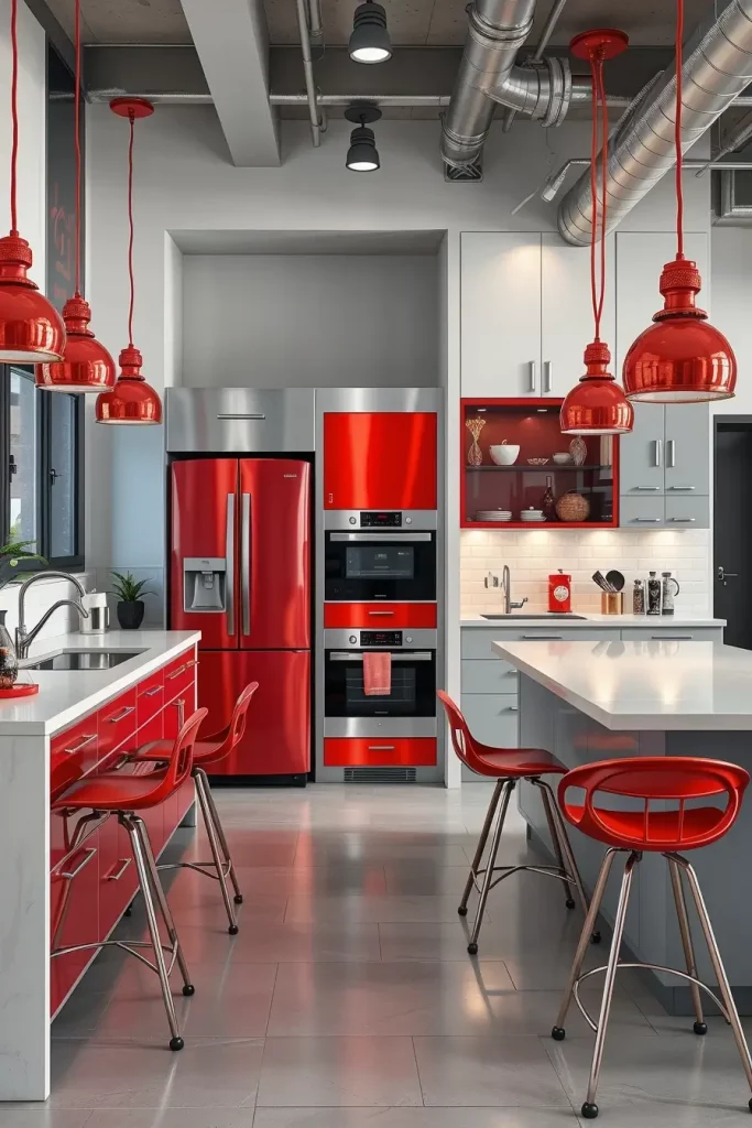 When I am designing a kitchen which has red metallic finishes, I consider balance. One can use a red refrigerator as a focal point, and the smaller metallic accents, like drawer handles or a red steel backsplash, can unify the appearance. I have also found bar stools that have shiny red legs or pendant lights that have red metal shades that make a unified design, but it does not look overdone. These are not mere functional pieces, they are design statements.